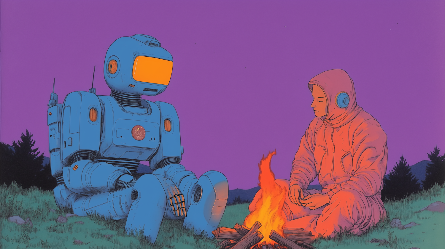 A humanoid robot and a human sit by a glowing campfire under a purple sky, sharing a tranquil moment in a scenic outdoor setting.