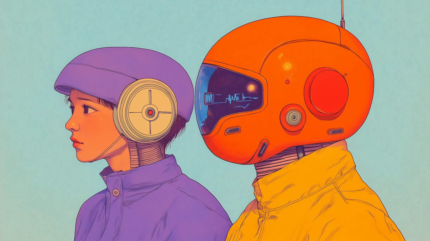 Futuristic illustration of two individuals with robotic helmets, one in purple and the other in orange, set against a light blue background.