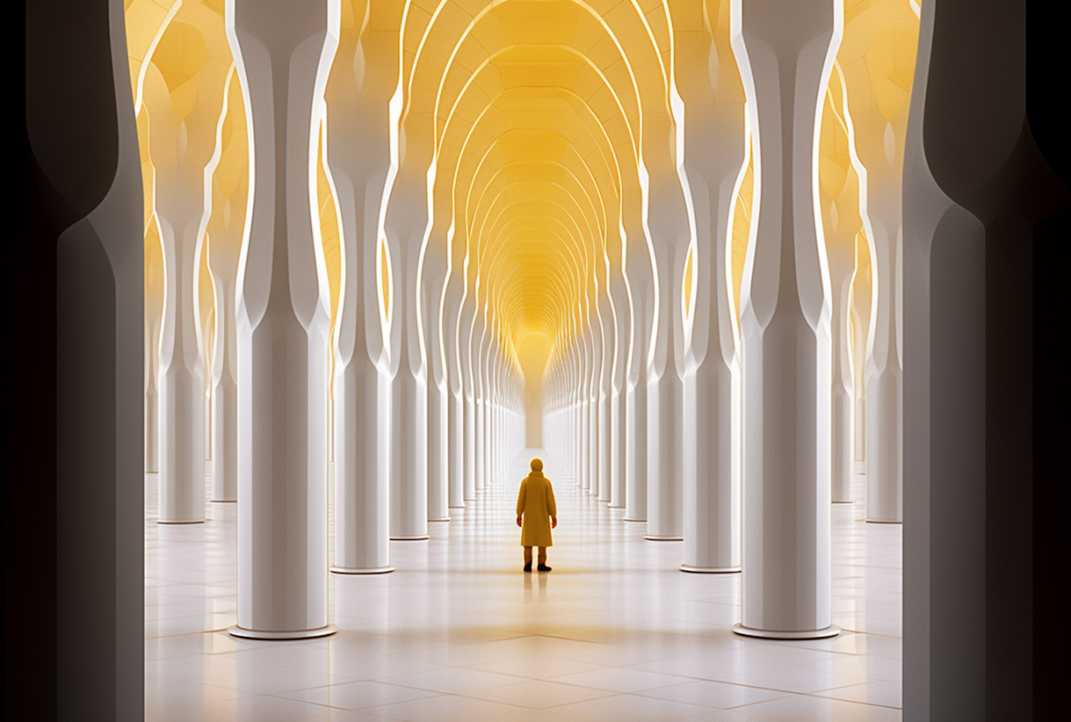 A lone figure in a yellow coat stands in a grand hall with towering white columns and golden arches, creating a serene atmosphere.