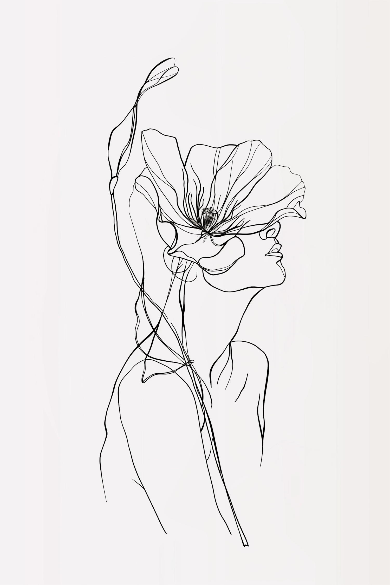 Minimalist line art of a woman with a large flower covering her face, blending human and nature in an elegant, modern design.