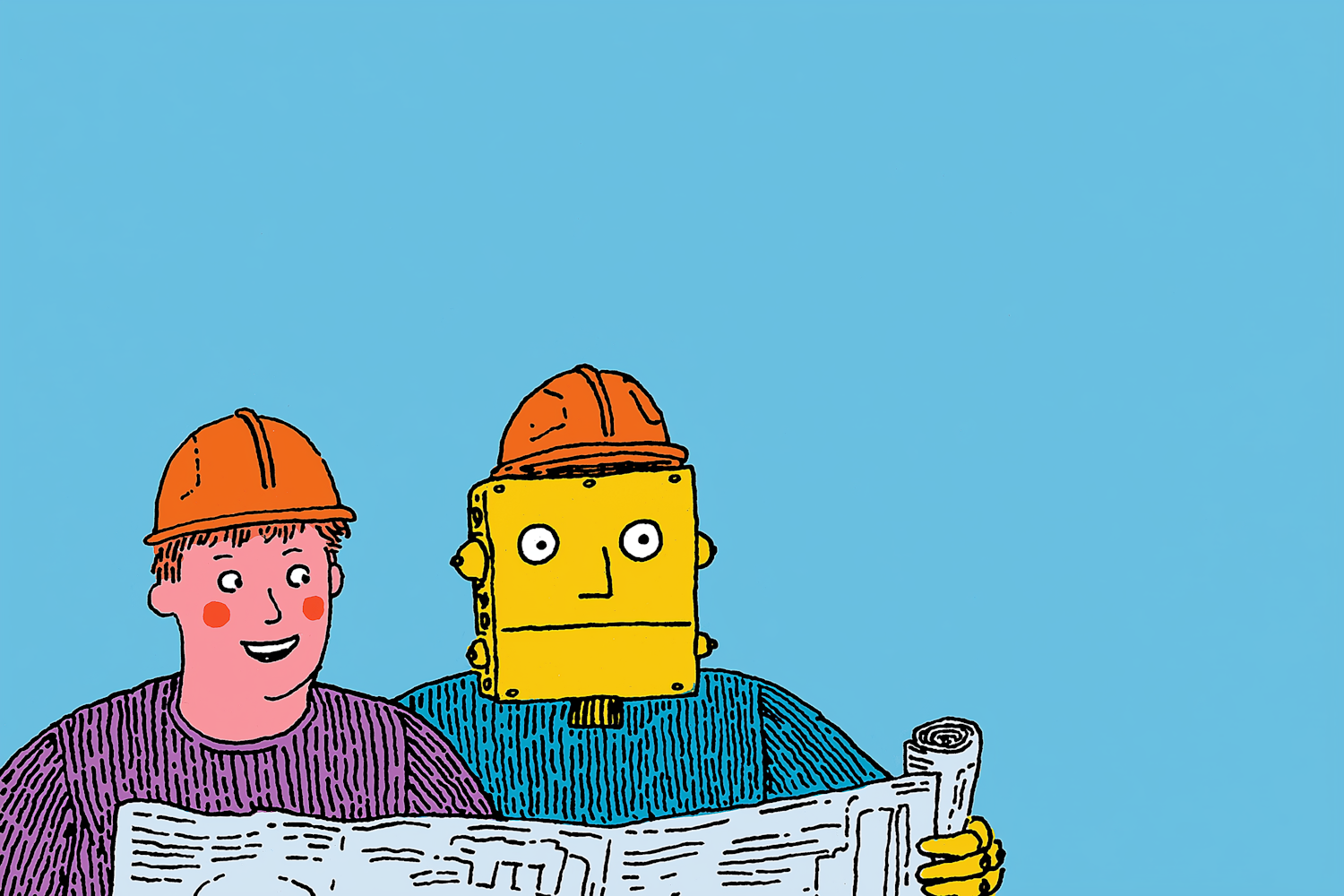 A cheerful illustration of a human and a robot in hard hats reviewing blueprints, symbolizing teamwork and innovation.