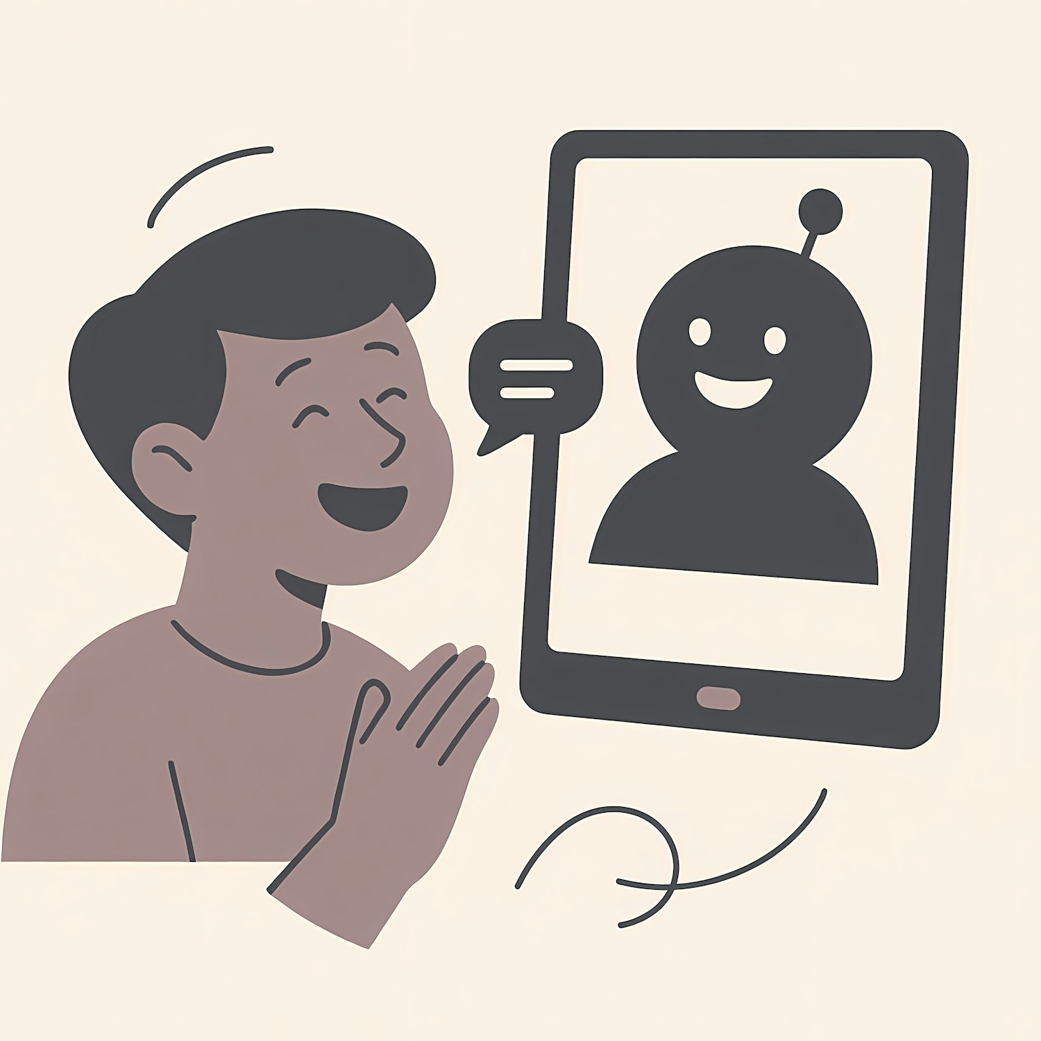 Minimalist illustration of a person happily chatting with a smiling robot on a tablet screen, symbolizing human-AI interaction.