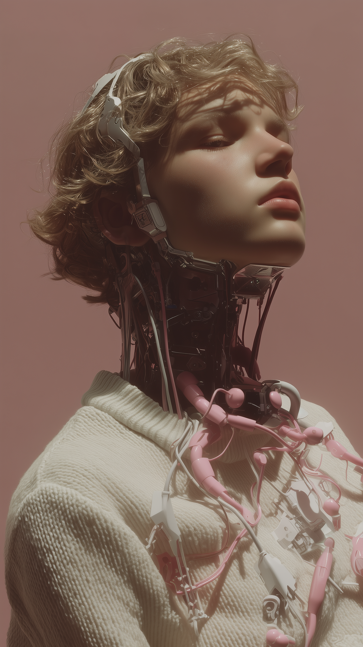 A futuristic humanoid with blonde hair and exposed pink and white mechanical components, set against a soft pink background.