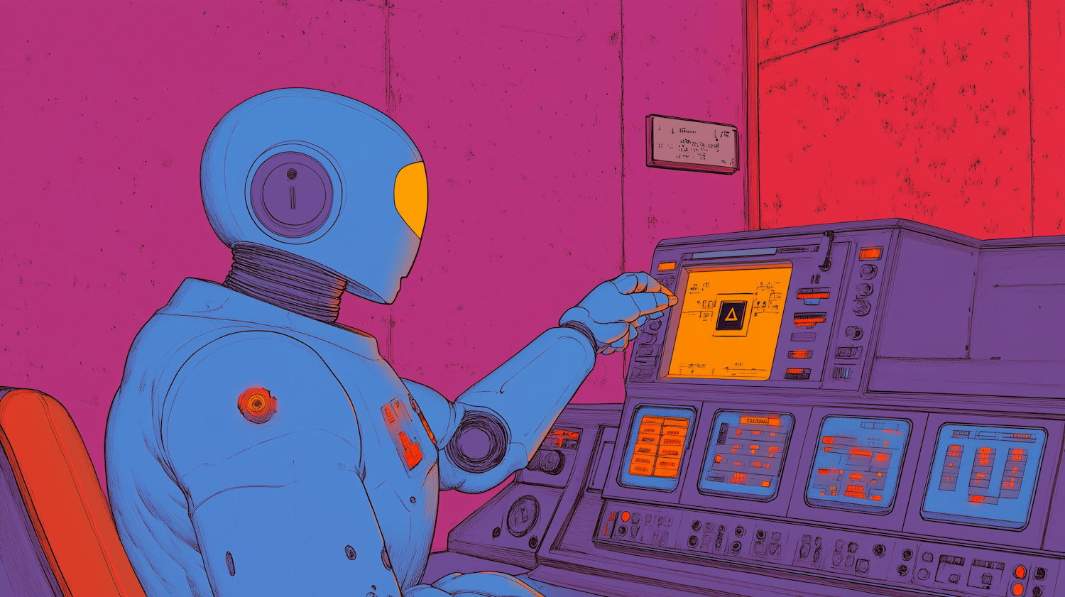 Futuristic robot operating a colorful control panel in a vibrant pink room, showcasing advanced technology and sleek design.
