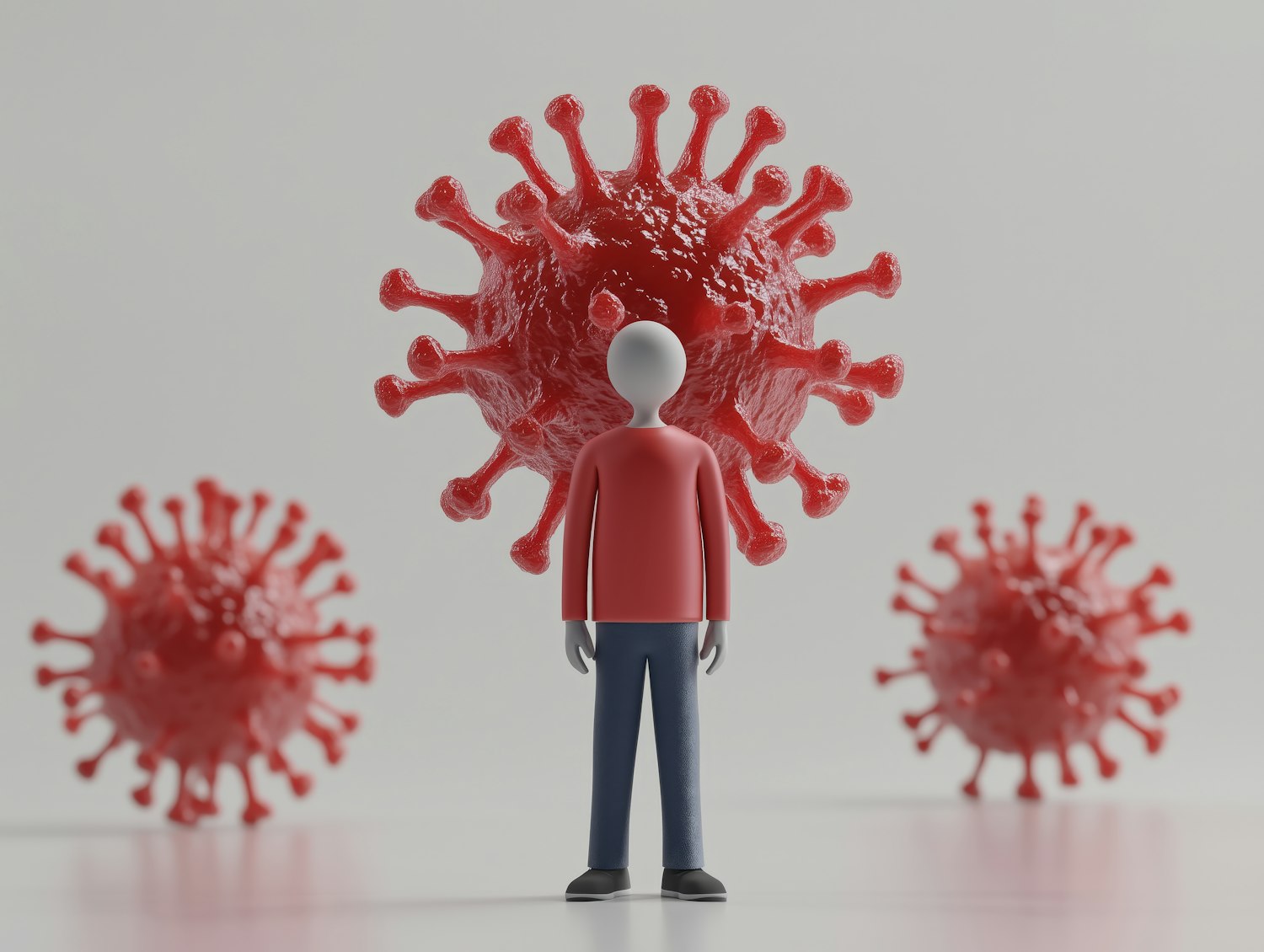 3D-rendered figure in red shirt surrounded by oversized red virus-like structures on a minimal gray background.