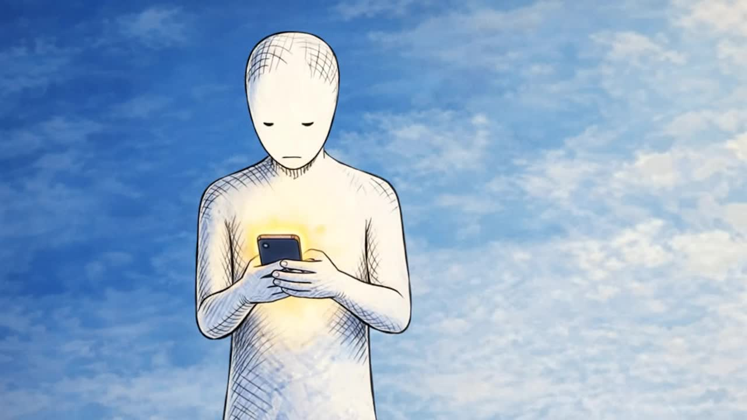 A minimalist illustration of a humanoid figure holding a glowing smartphone against a serene blue sky background.