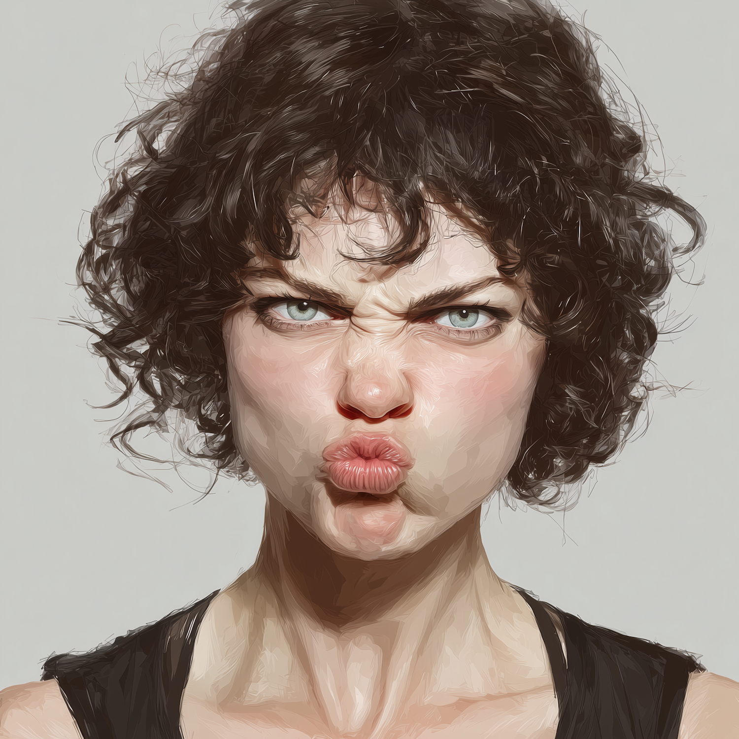 Digital illustration of a person with curly hair making a funny face, featuring a painted texture and a neutral background.