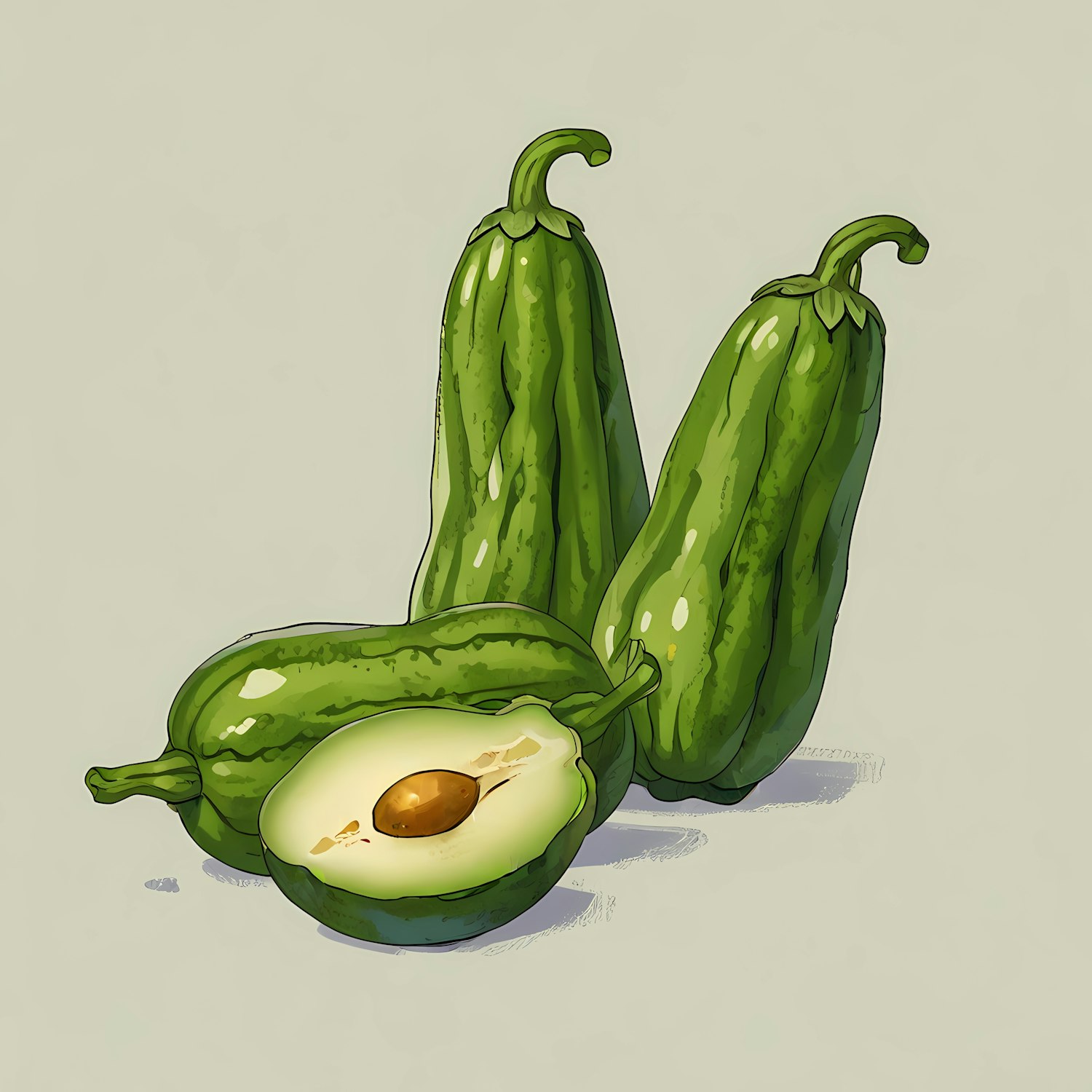 Illustration of three glossy green fruits, one cut open to reveal a creamy interior and brown seed, resembling a cucumber-avocado hybrid.