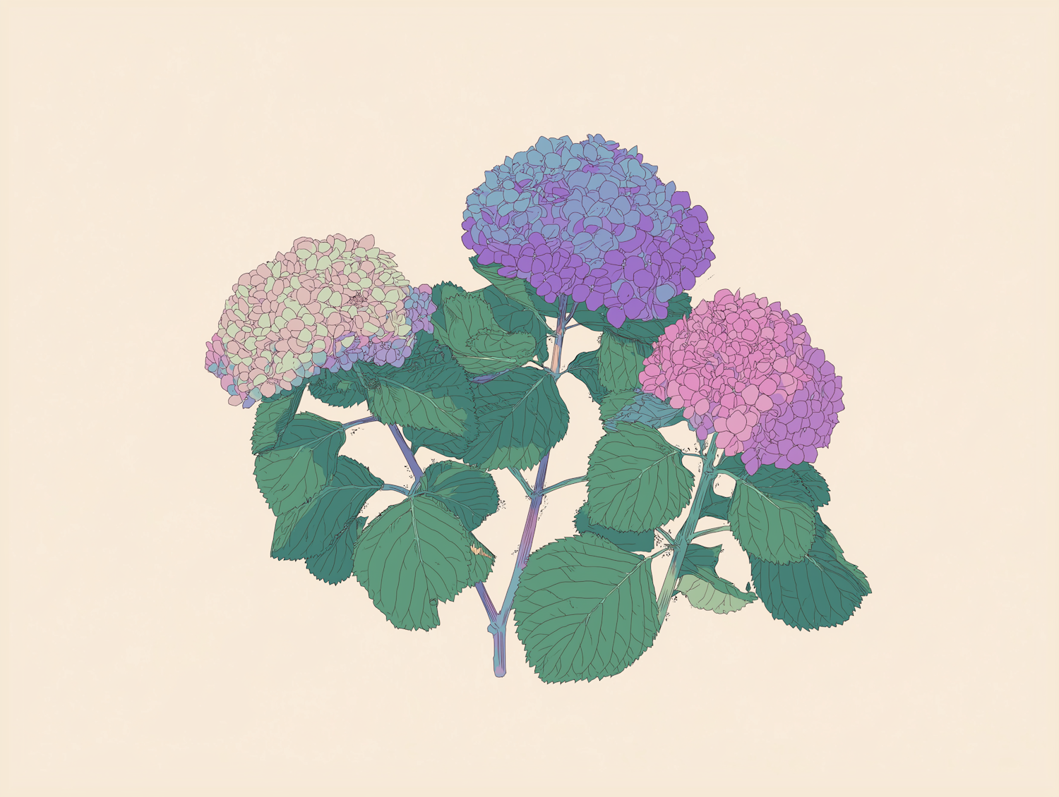 Beautiful artistic illustration of colorful hydrangea flowers on a neutral background, detailed and antique hydrangea colors to enhance the natural beauty.