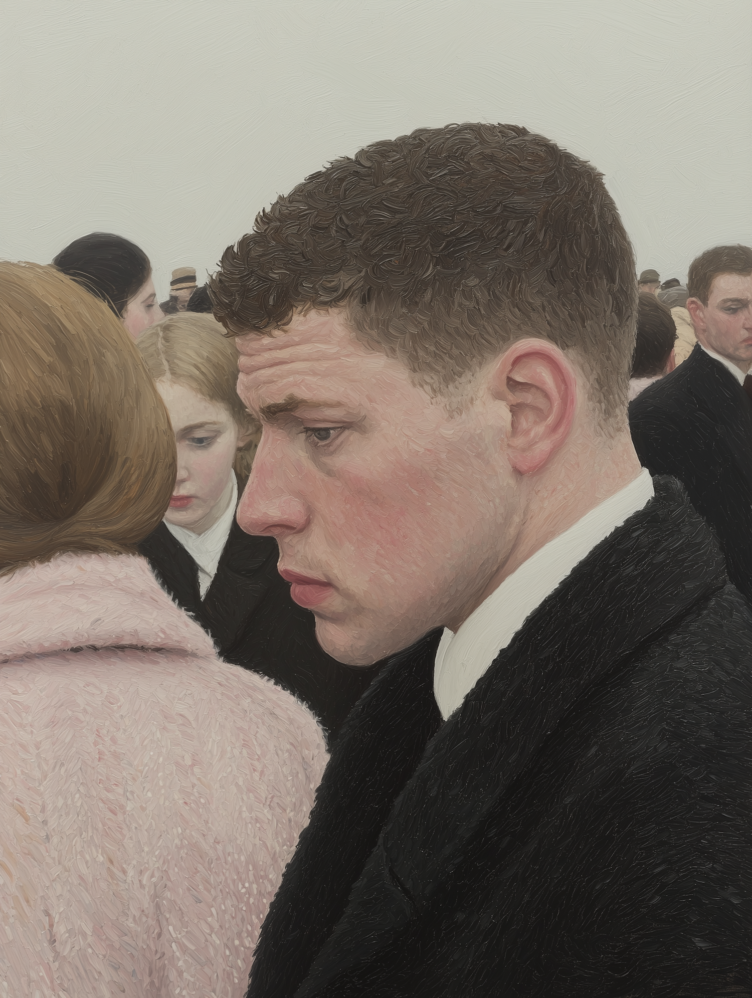 Hyper-realistic painting of a young man in a black coat at a formal gathering, surrounded by others in muted tones.