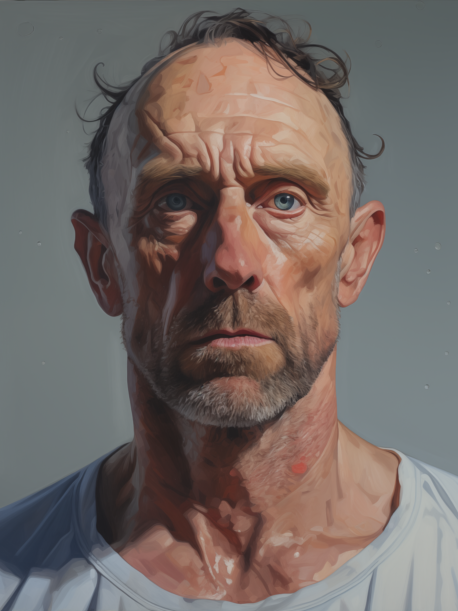 Hyperrealistic portrait of a middle-aged man with textured details, wearing a white t-shirt, against a neutral background.