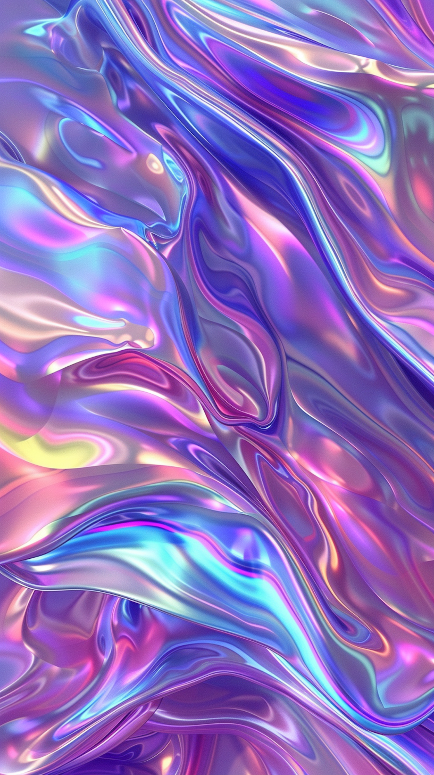 Abstract iridescent waves with vibrant purples, blues, and pinks create a mesmerizing, fluid metallic texture.