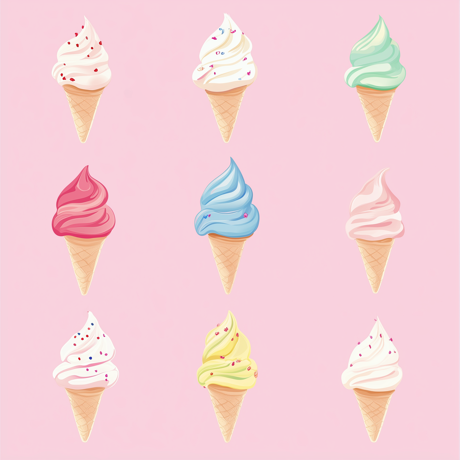 A cute illustration of colorful ice cream cones with sprinkles on a pastel pink background. Perfect for summer vibes and dessert lovers!