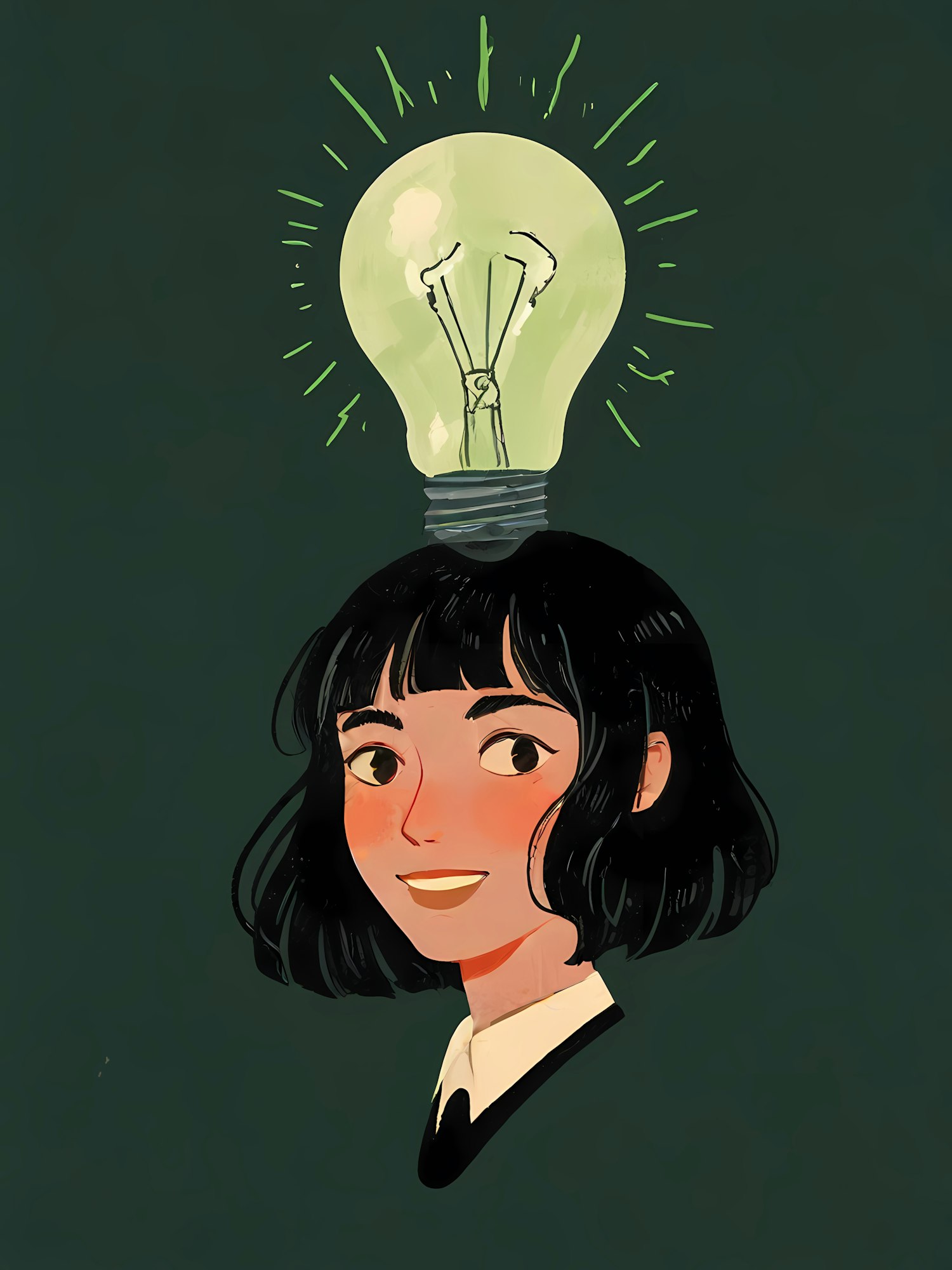 Illustration of a woman with a light bulb above her head, symbolizing inspiration. Dark green background highlights the glowing bulb.