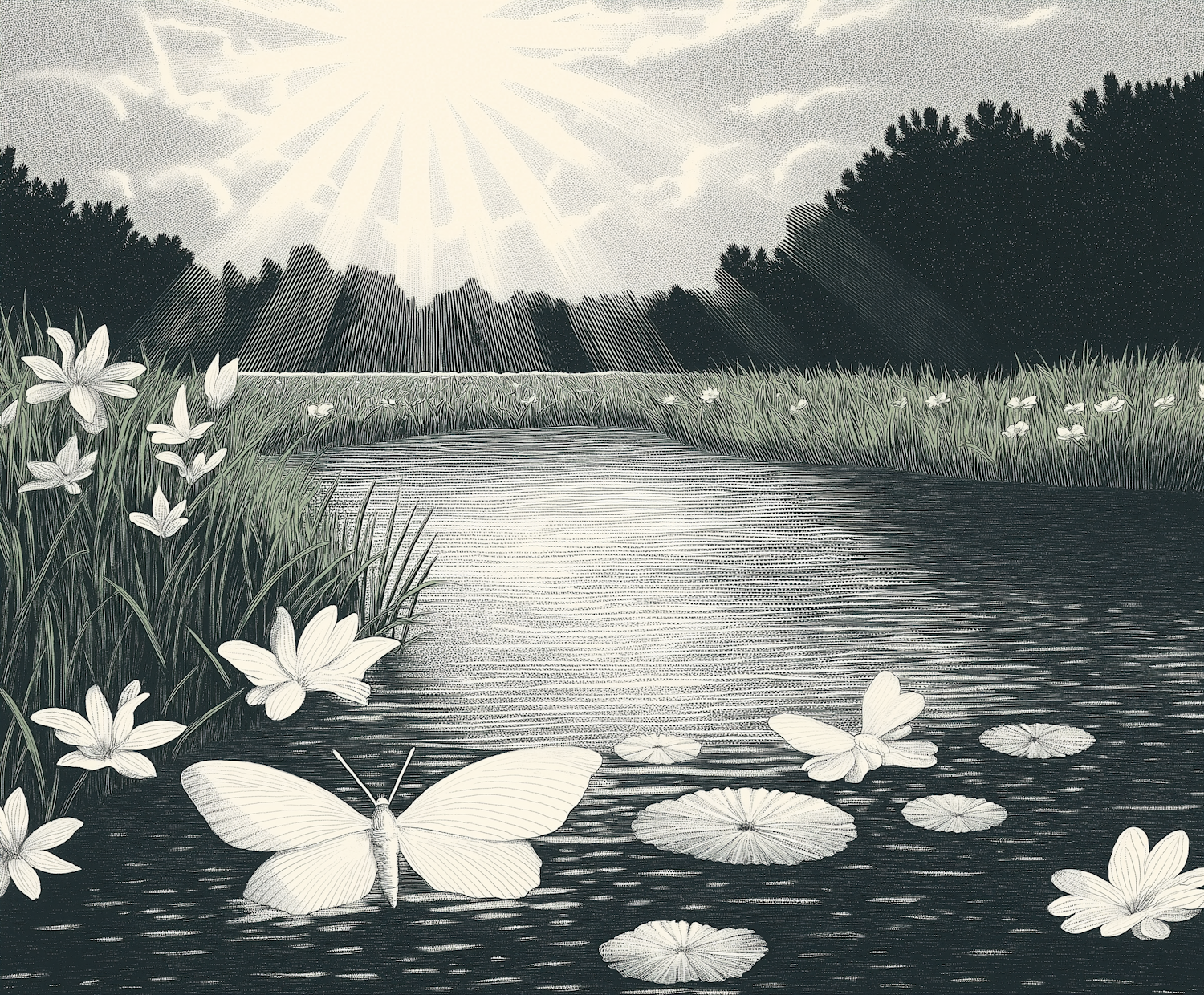 Serene river scene with butterflies, white flowers, and sunlit water, surrounded by lush greenery and trees in a monochromatic illustration.