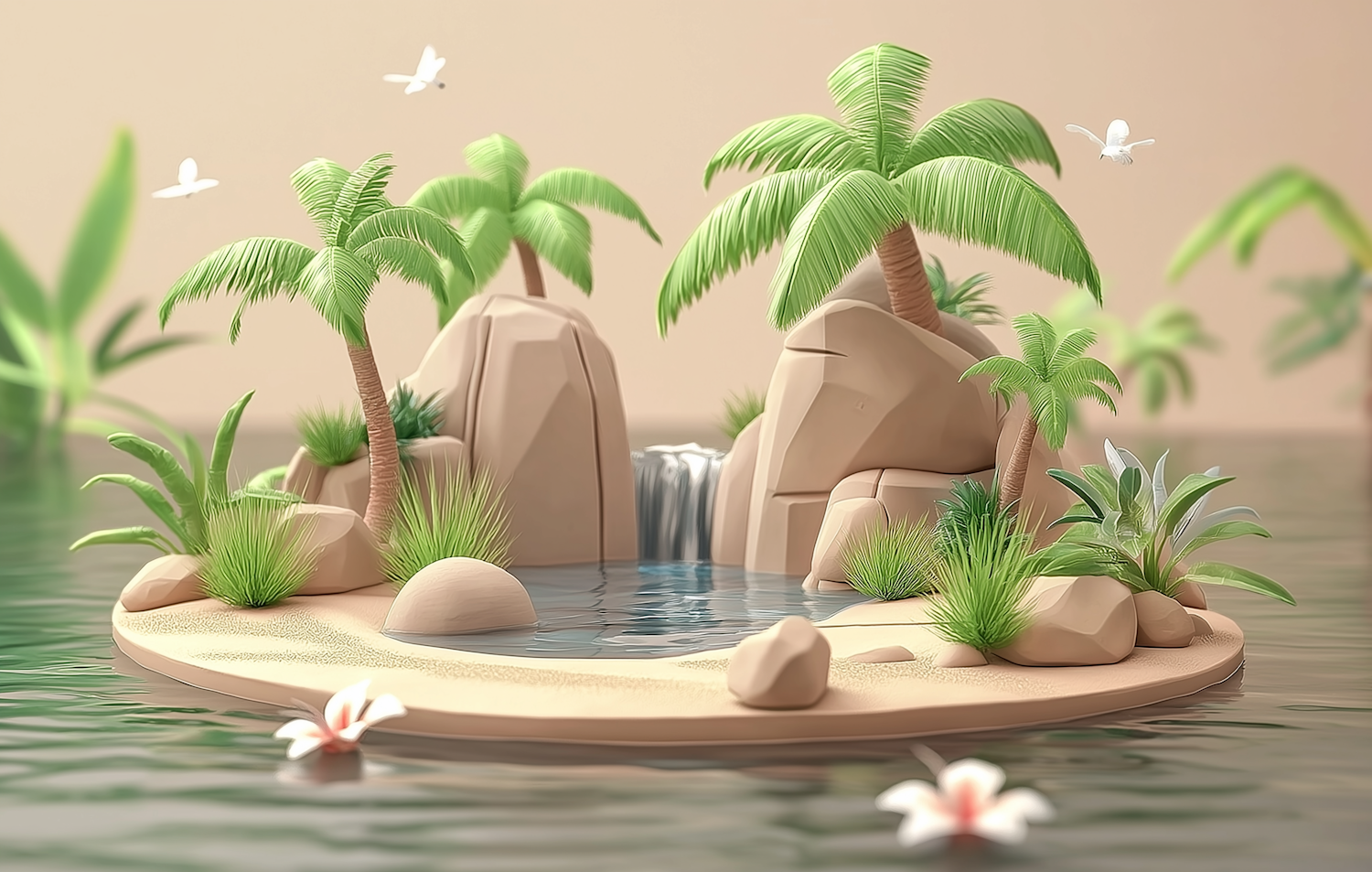 Serene tropical island with palm trees, a waterfall, and birds flying above, set in a tranquil, pastel-colored environment.