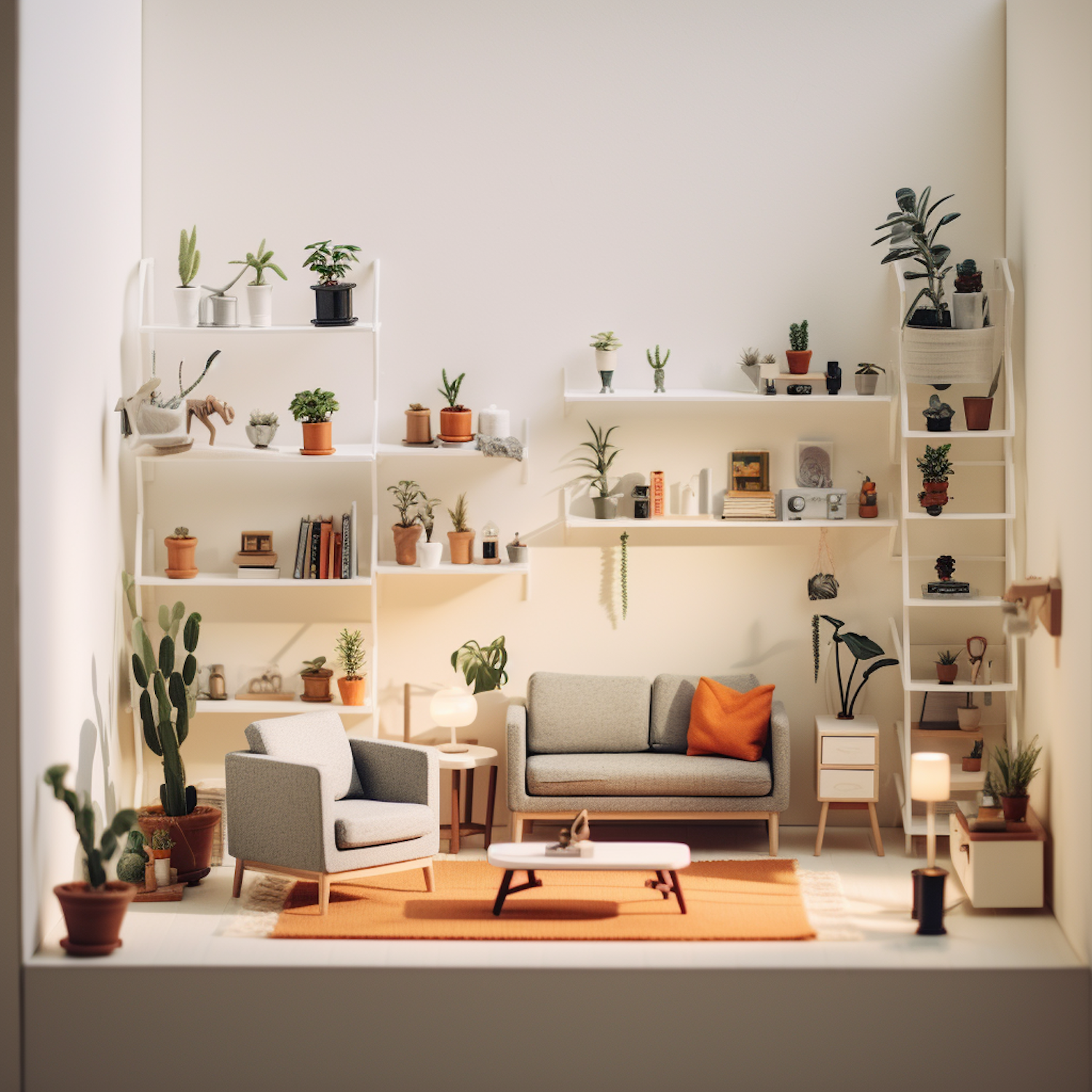 Modern living room with gray furniture, orange accents, and lush green plants on white shelves, creating a cozy, minimalist vibe.