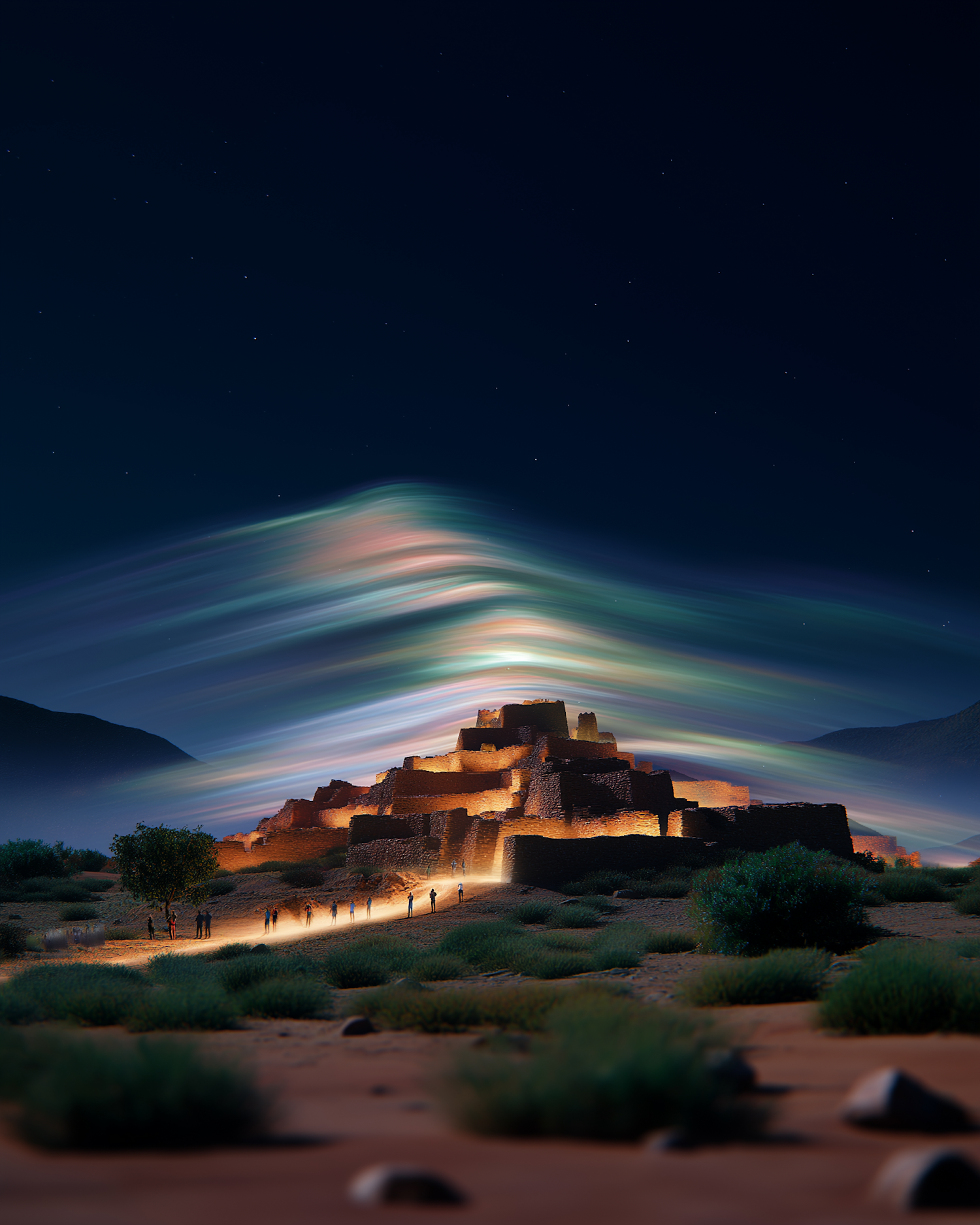 A glowing ancient pyramid under a vibrant aurora-like sky, surrounded by a desert landscape with silhouetted figures exploring.
