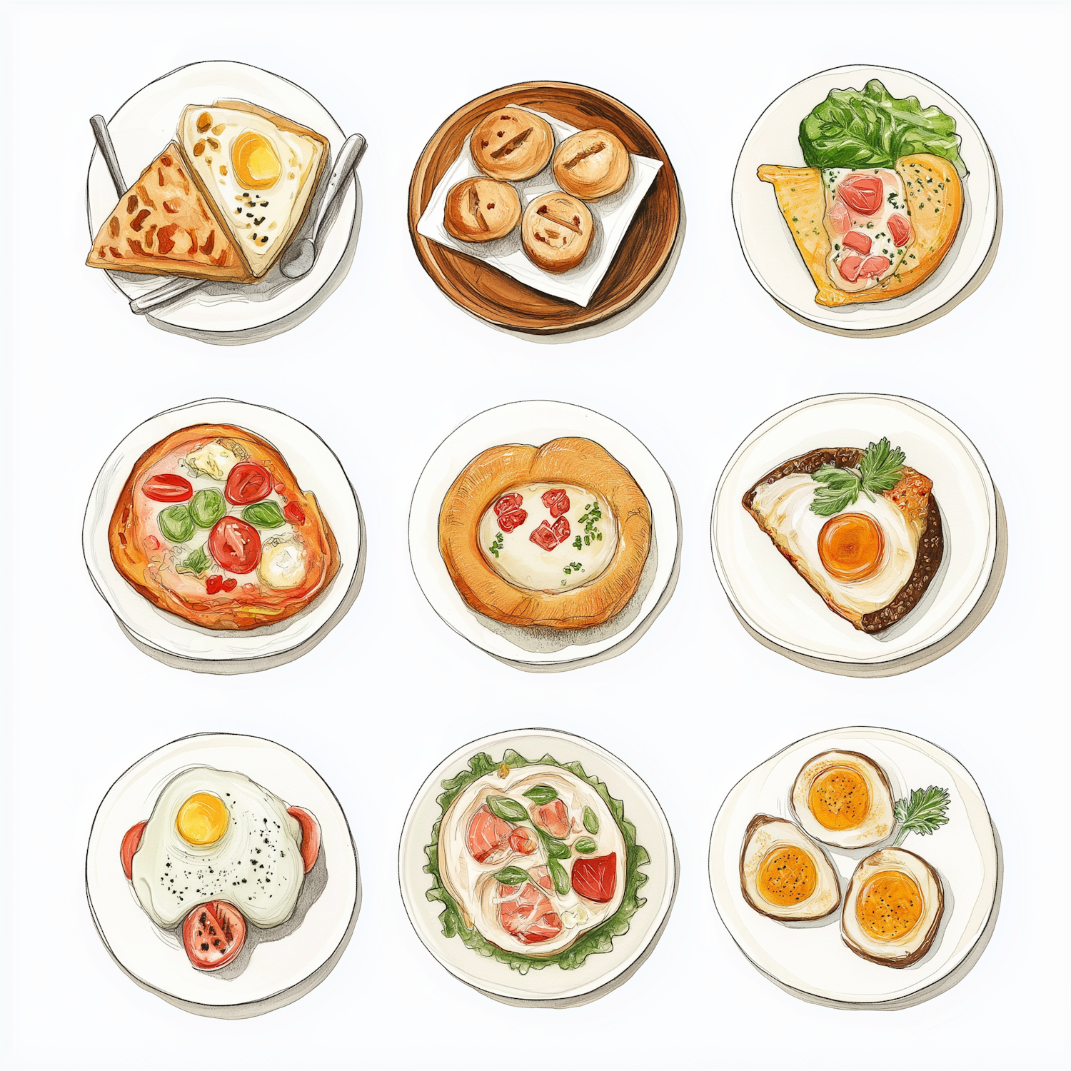 A vibrant illustration of nine breakfast dishes, from fried eggs to quiche and pastries, beautifully arranged on white plates.