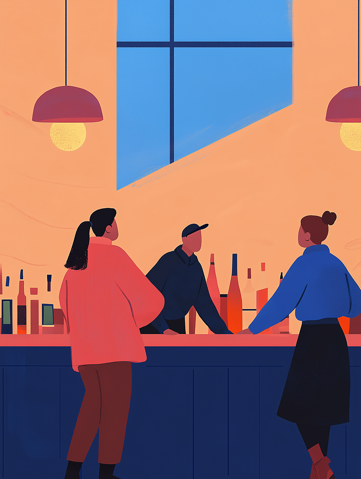 Stylish bar scene with three people conversing, warm tones, and a large window. Cozy atmosphere with pendant lights and colorful bottles.