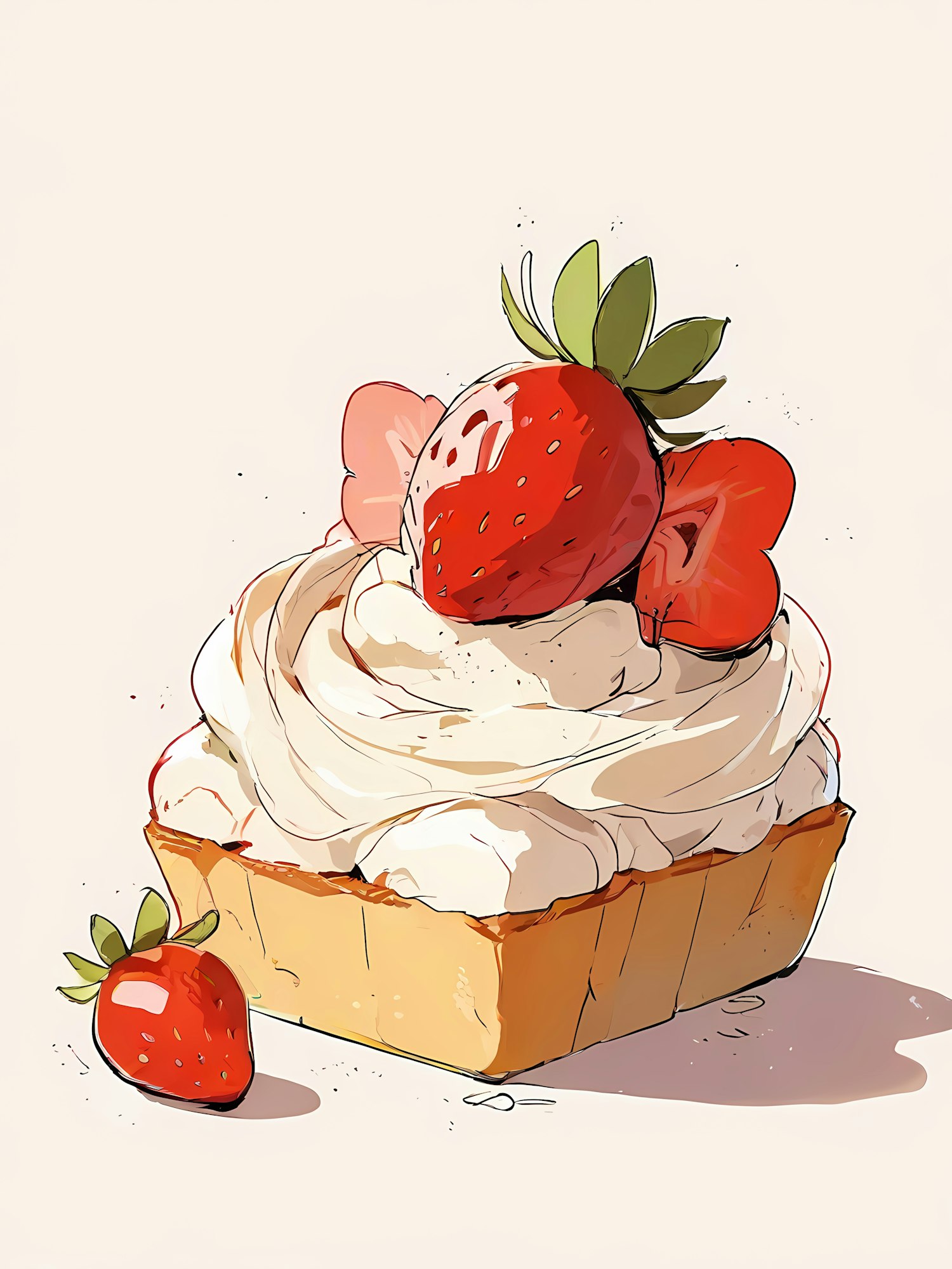 Illustrated dessert tart with whipped cream and strawberries on a beige background, showcasing vibrant colors and detailed textures.