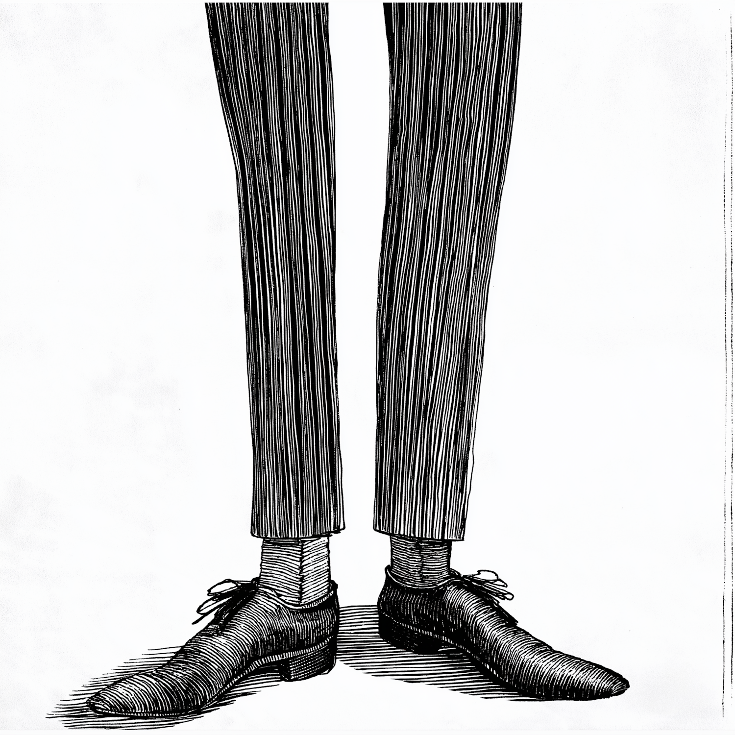 Black-and-white illustration of pinstriped trousers and formal lace-up shoes, showcasing intricate line work and shading.