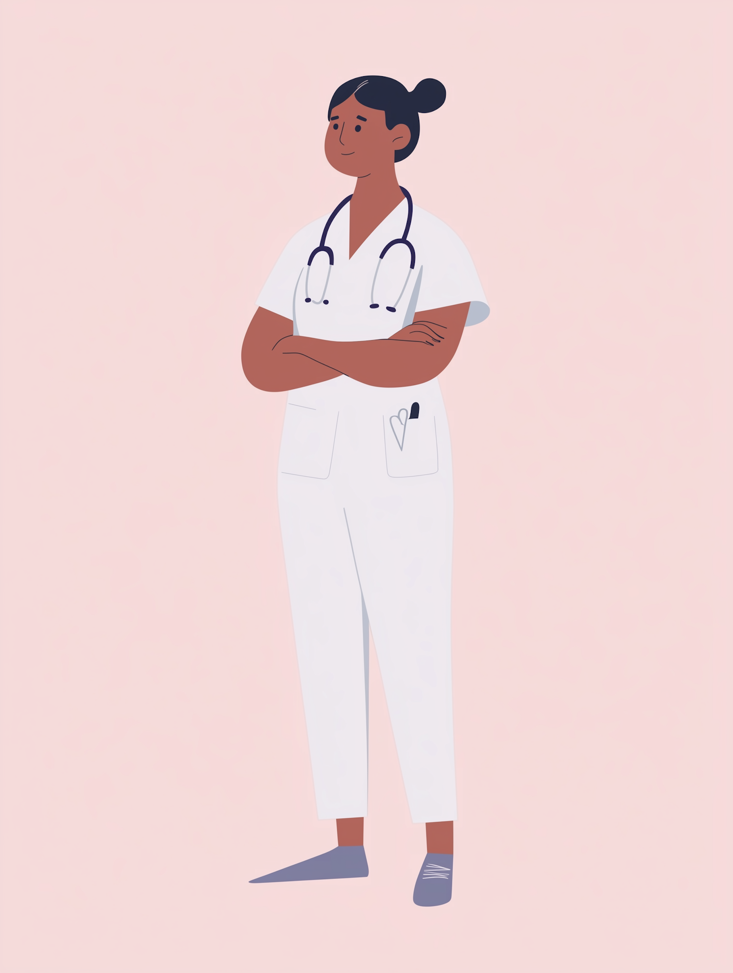 Illustration of a healthcare professional in a white uniform with a stethoscope, standing confidently against a soft pink background.