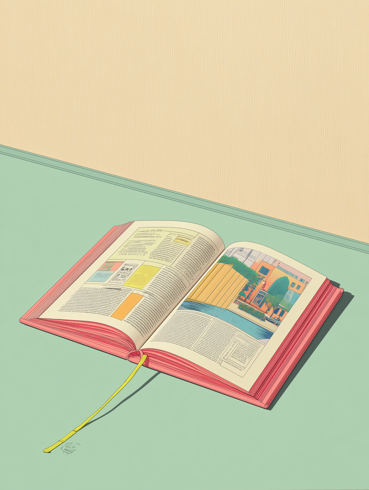 A vibrant illustration of an open book with colorful pages and a yellow bookmark, resting on a mint-green surface against a beige wall.