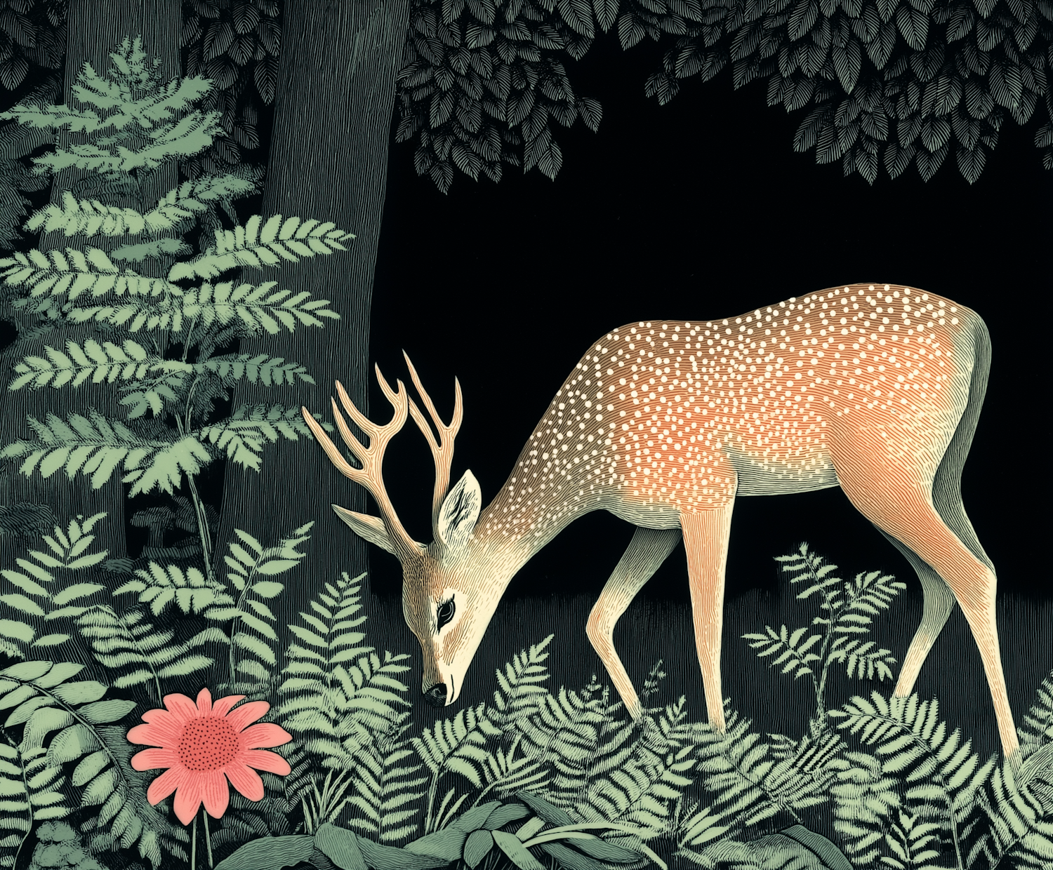 Illustrated deer grazing among lush ferns with a striking pink flower in a serene forest setting.