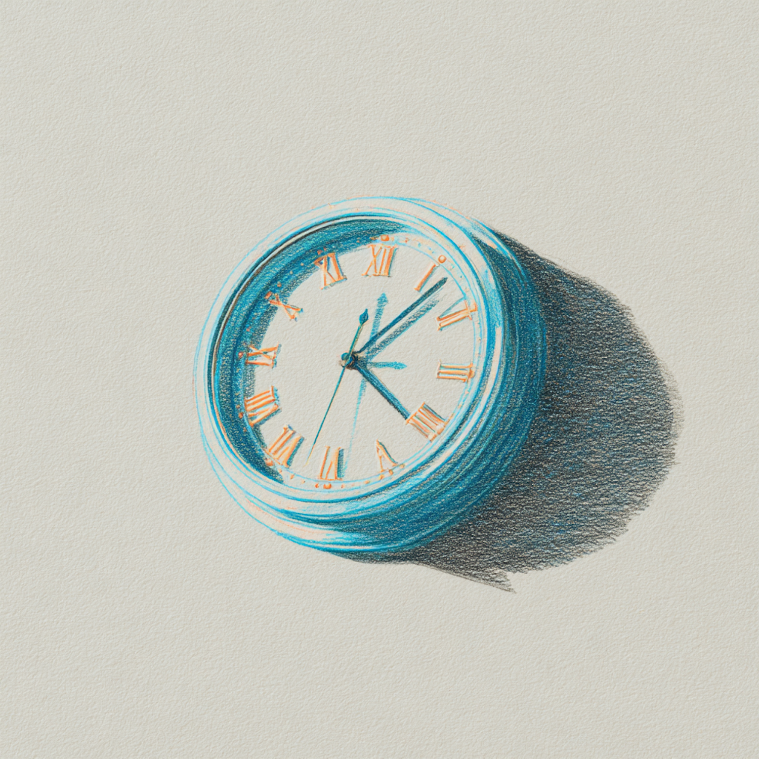 A beautifully drawn clock with Roman numerals and a blue frame, casting a shadow on a textured background. Perfect for artistic inspiration.