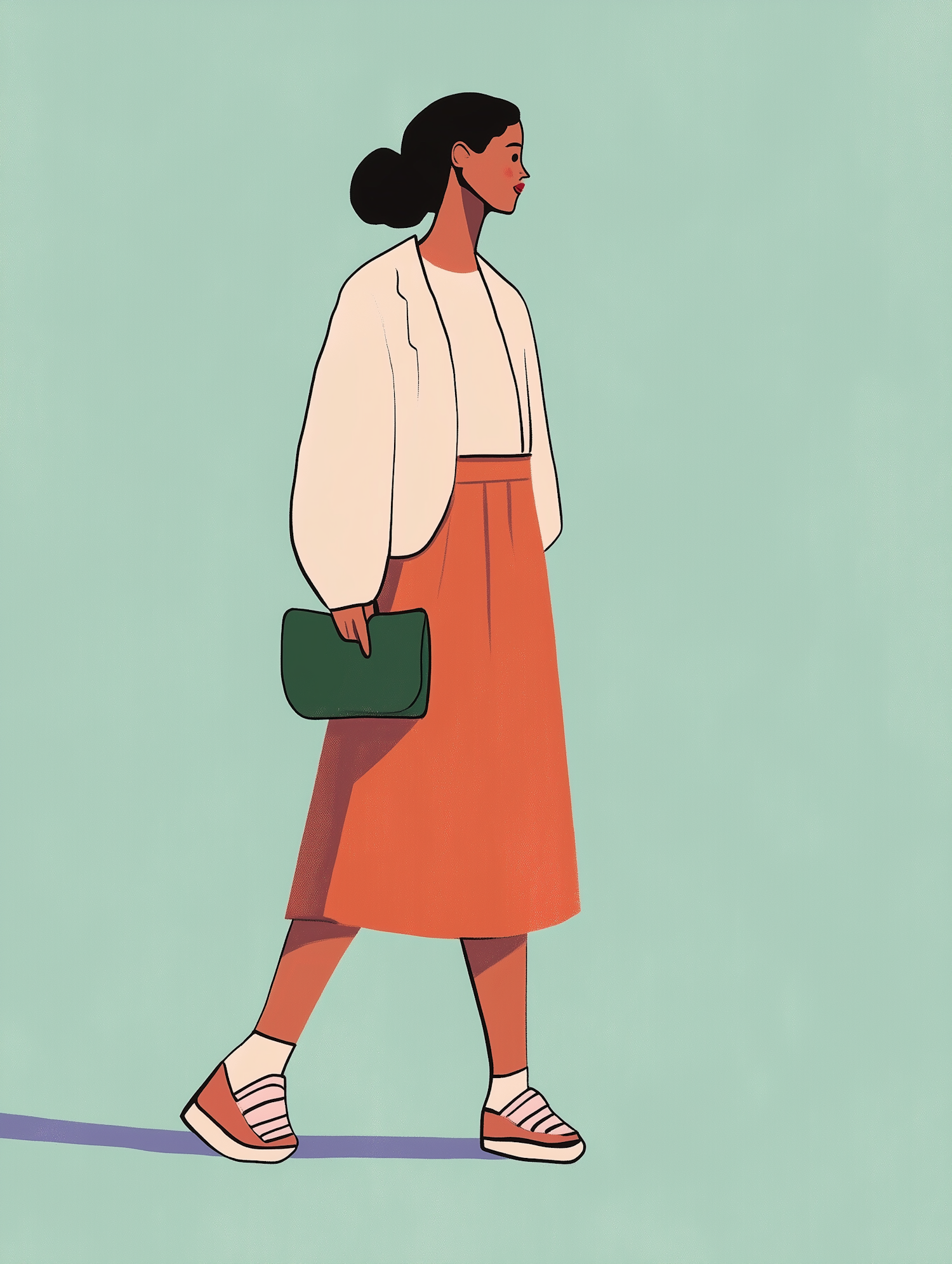 Stylish illustration of a woman in a white jacket and orange skirt, holding a green clutch against a mint green background.