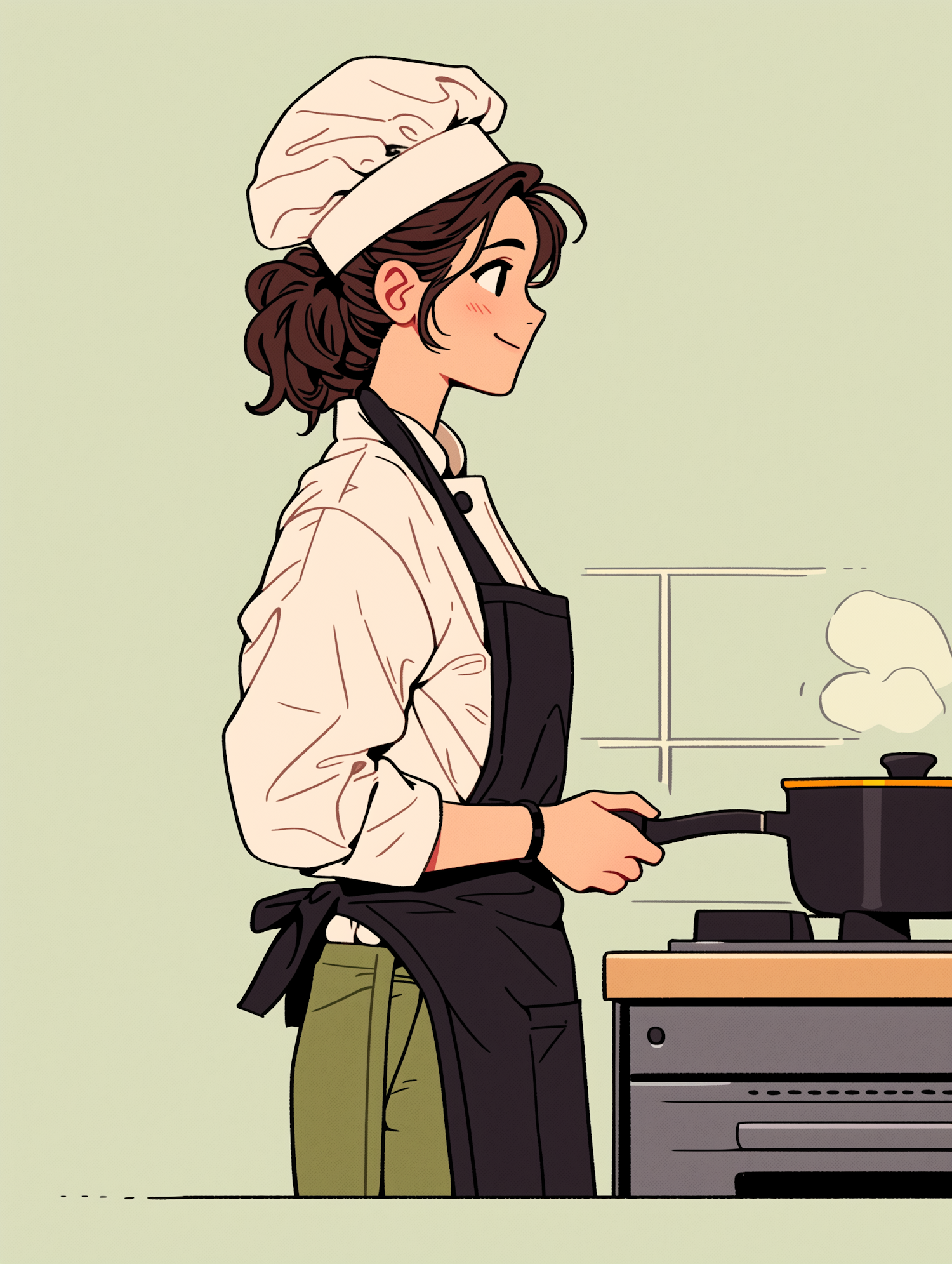 Illustration of a female chef cooking with a saucepan, wearing a white hat and apron, against a light green background.
