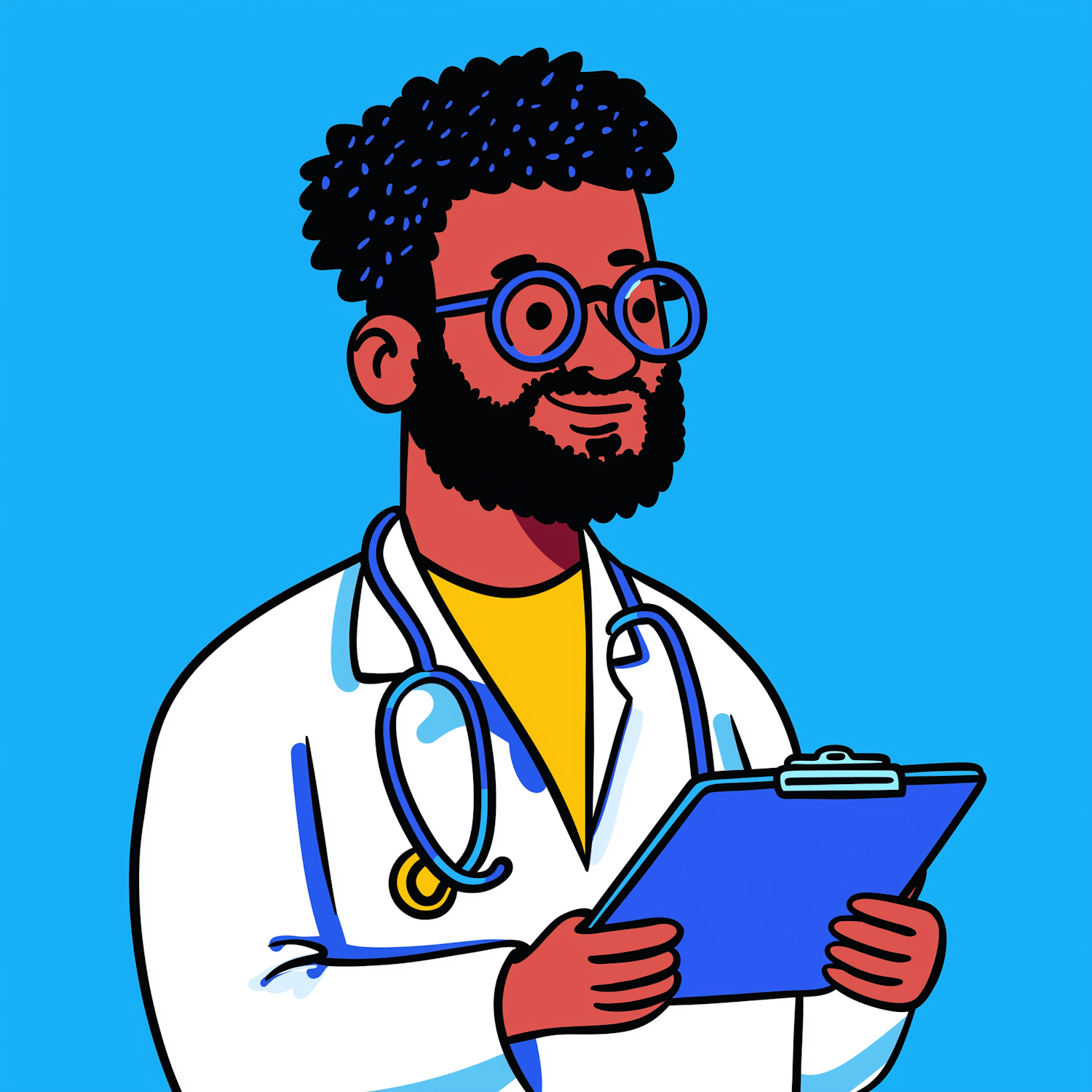 Cartoon illustration of a Black male doctor with glasses, beard, and stethoscope, holding a clipboard against a bright blue background.