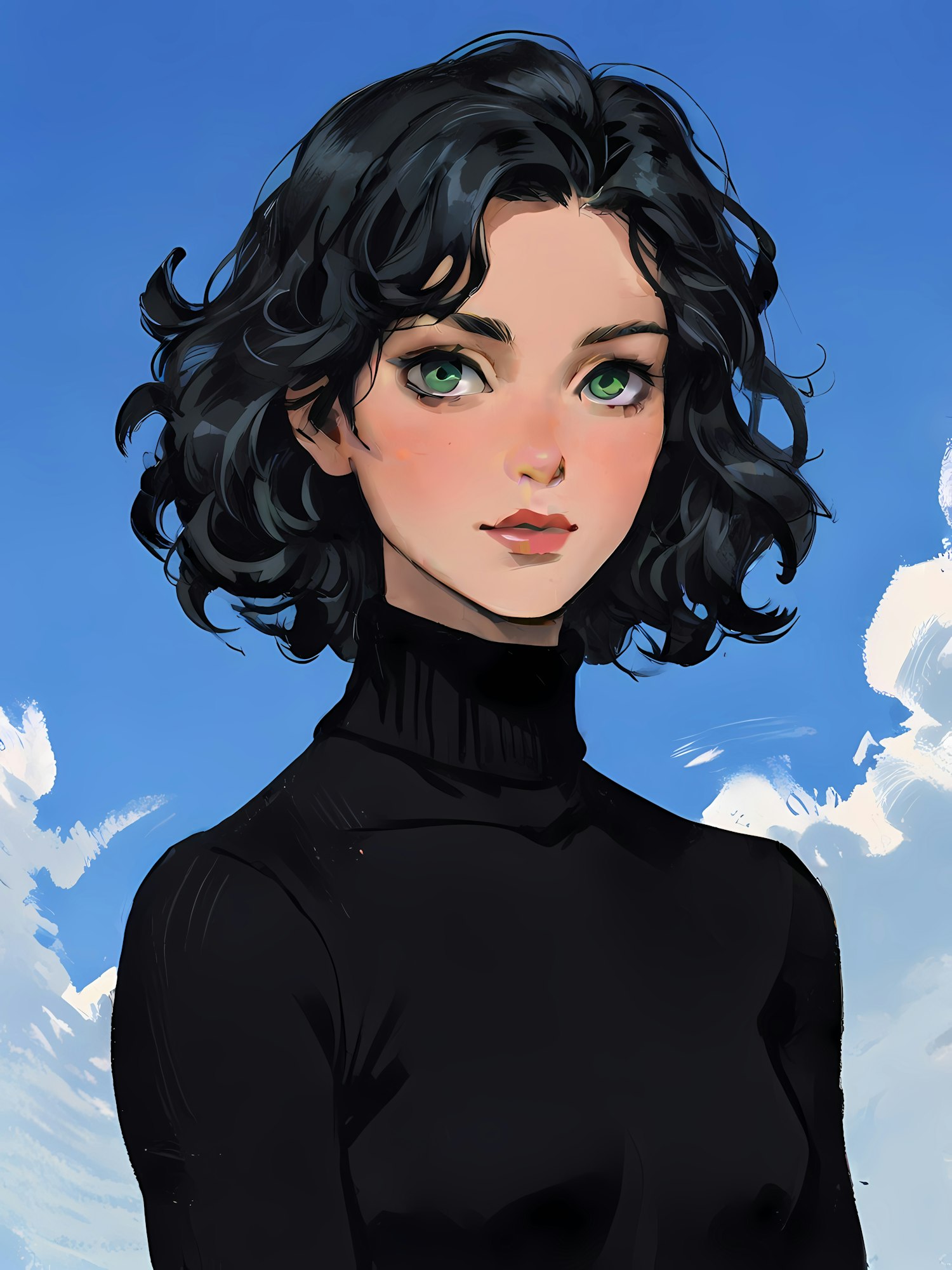 Stylized illustration of a person with short black hair and green eyes against a blue sky, wearing a black turtleneck sweater.