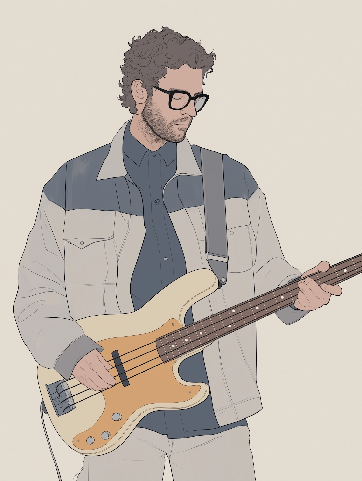 Illustration of a man with curly hair and glasses playing a cream-colored bass guitar, wearing a light jacket and dark shirt.