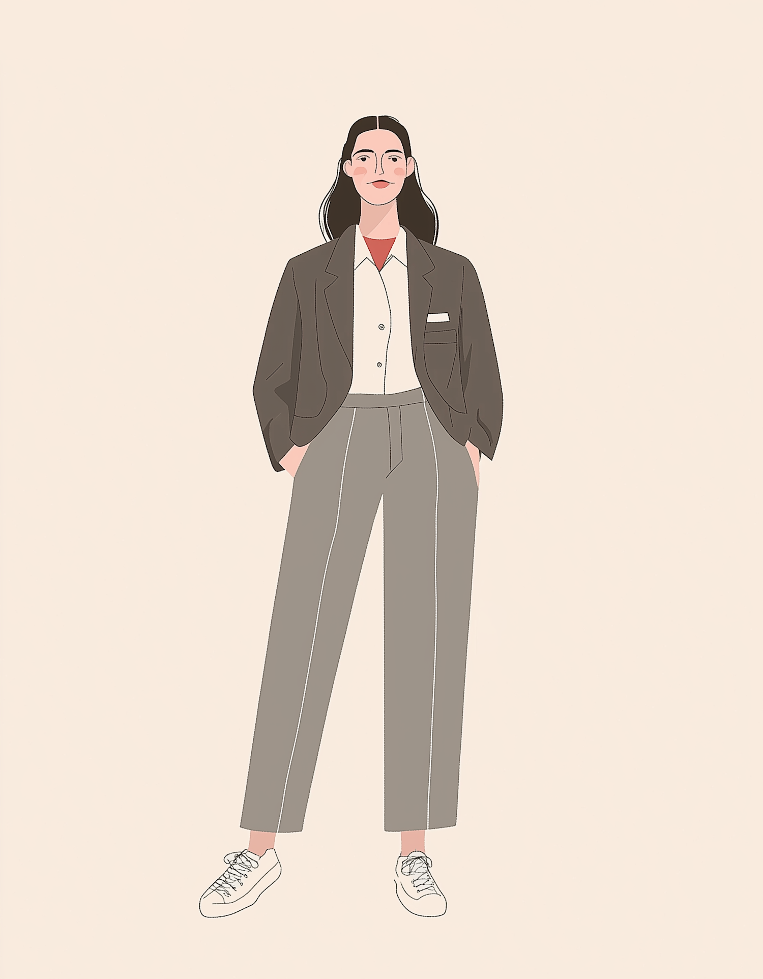 Illustration of a woman in a brown blazer and gray trousers, exuding confidence and style against a beige background.