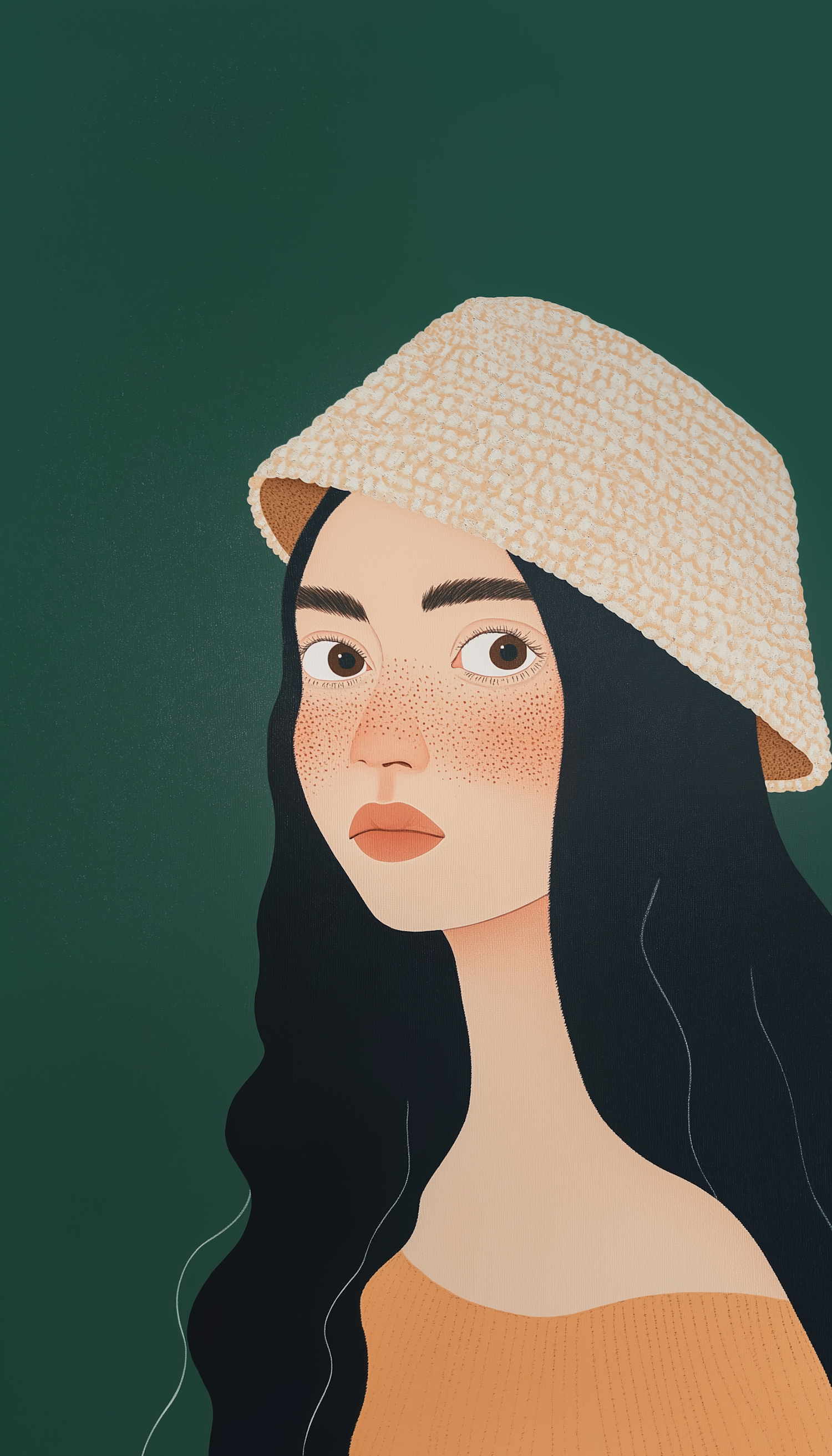 Stylized illustration of a freckled woman with black hair, beige bucket hat, and mustard top against a deep green background.