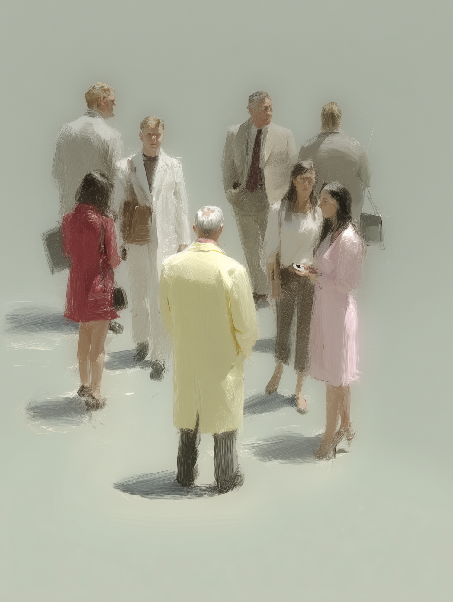 A dreamy, impressionistic illustration of a group of formally dressed people in muted tones, with a central figure in a bright yellow coat.