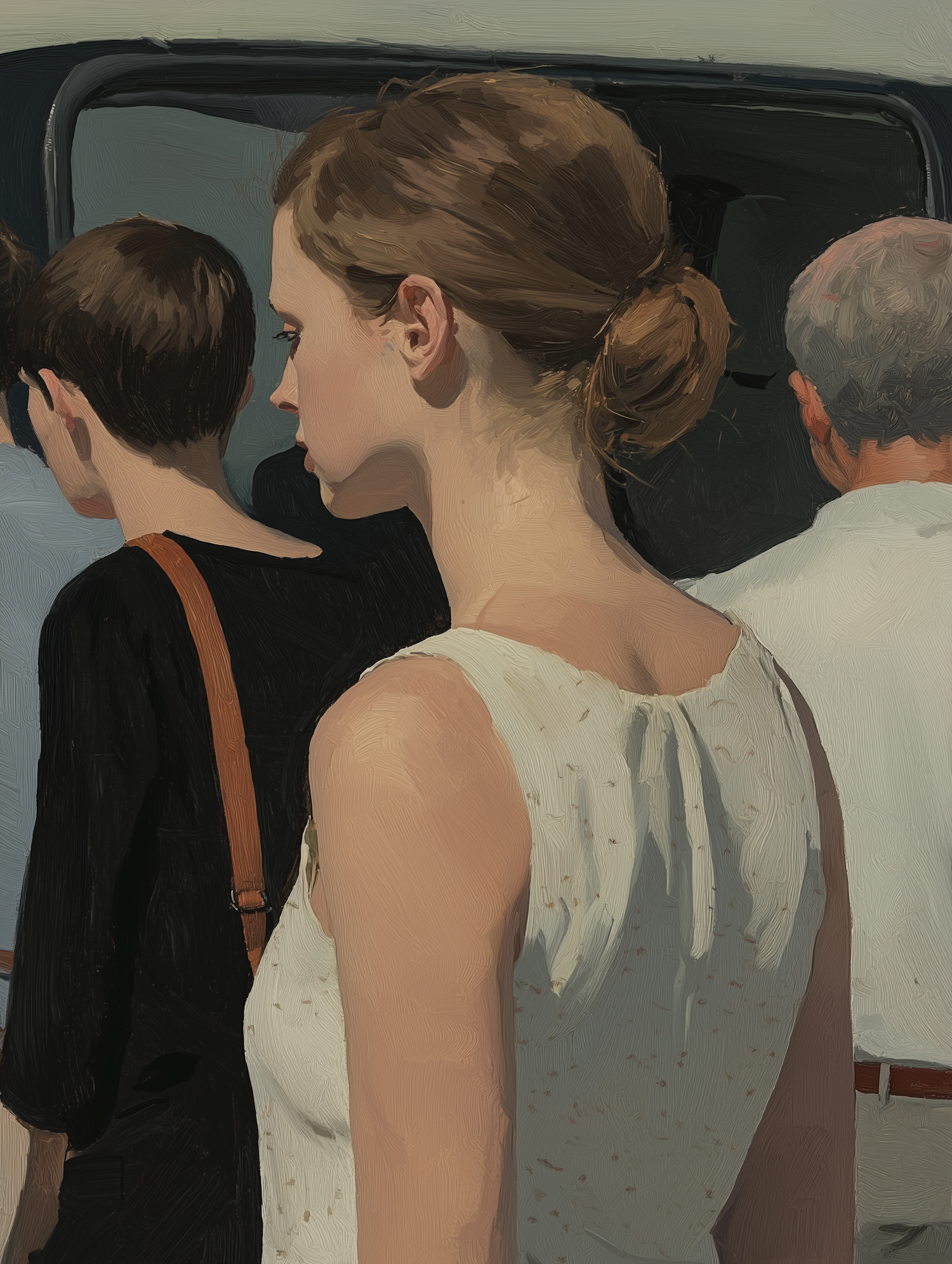 Painterly illustration of a young woman in a white dress with a low bun, surrounded by others in a serene outdoor setting.