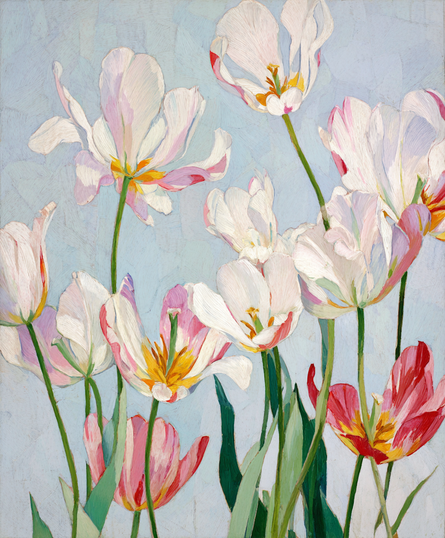 An impressionistic painting of tulips with vibrant white, red, pink, and yellow tones against a soft pastel blue background.
