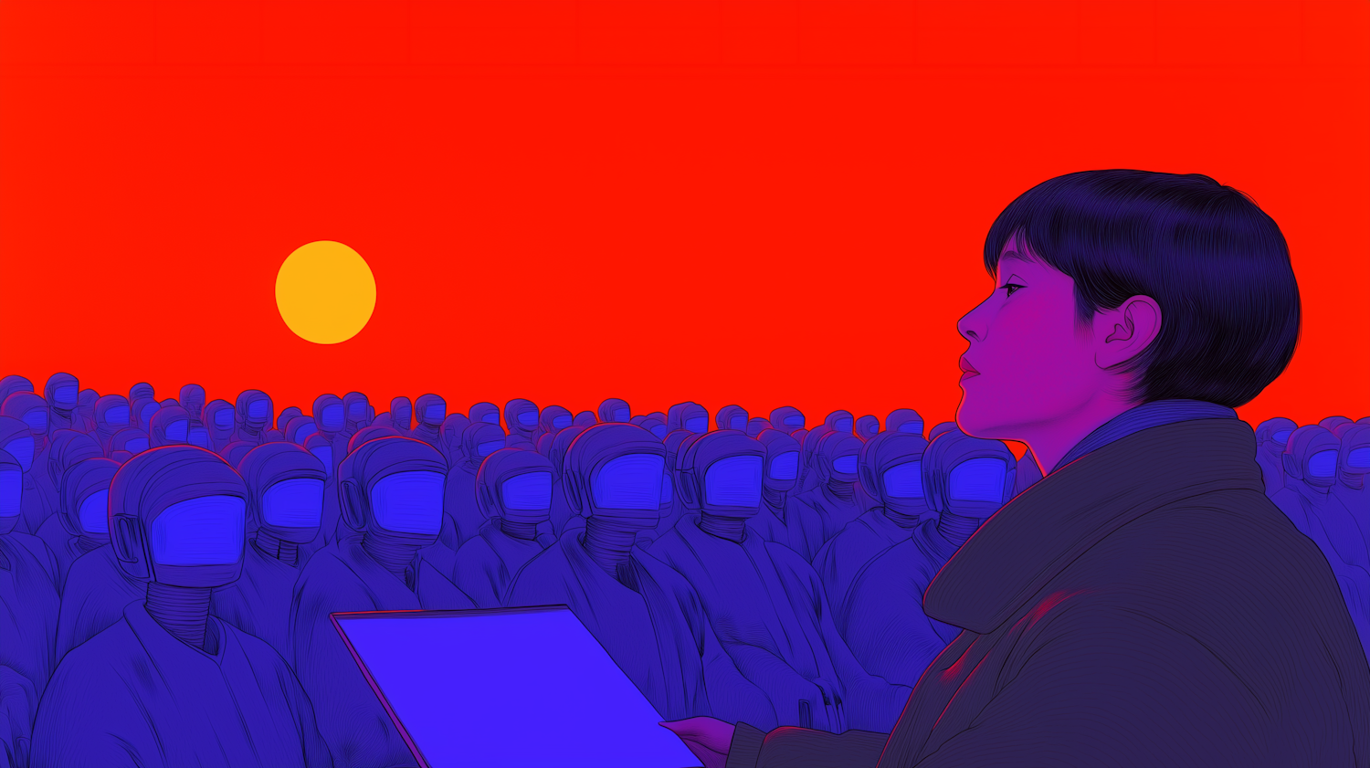 Futuristic illustration of a person with a clipboard amidst faceless blue figures, set against a vivid red background with a yellow sun.