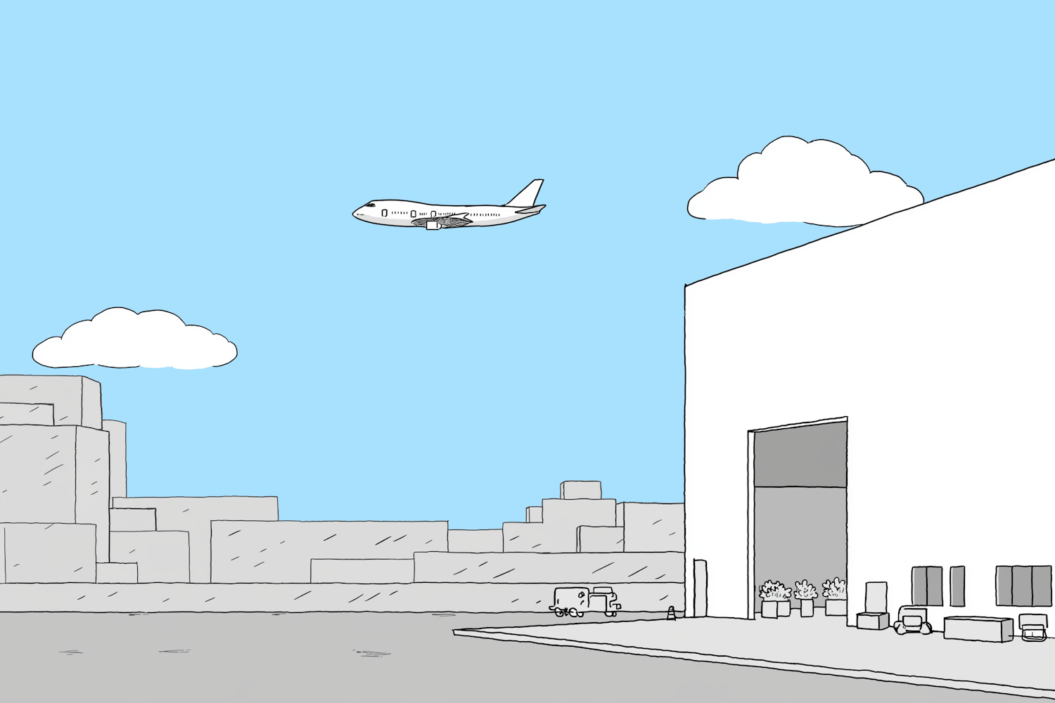 Minimalist illustration of an industrial area with a flying airplane, airplane hangar, and a small truck under a clear blue sky.