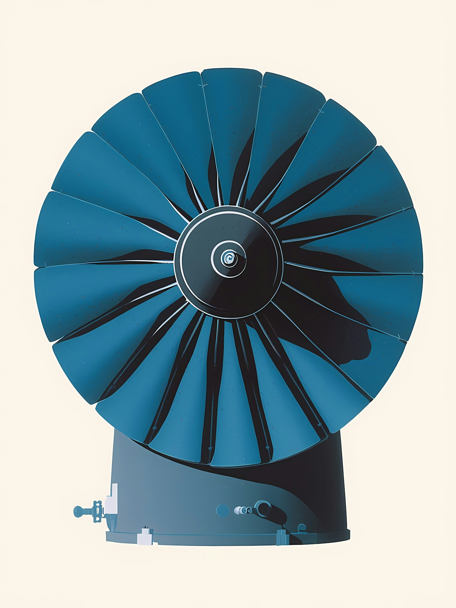 Stylized illustration of a blue industrial fan with detailed blades and a minimalist beige background, showcasing modern design elements.