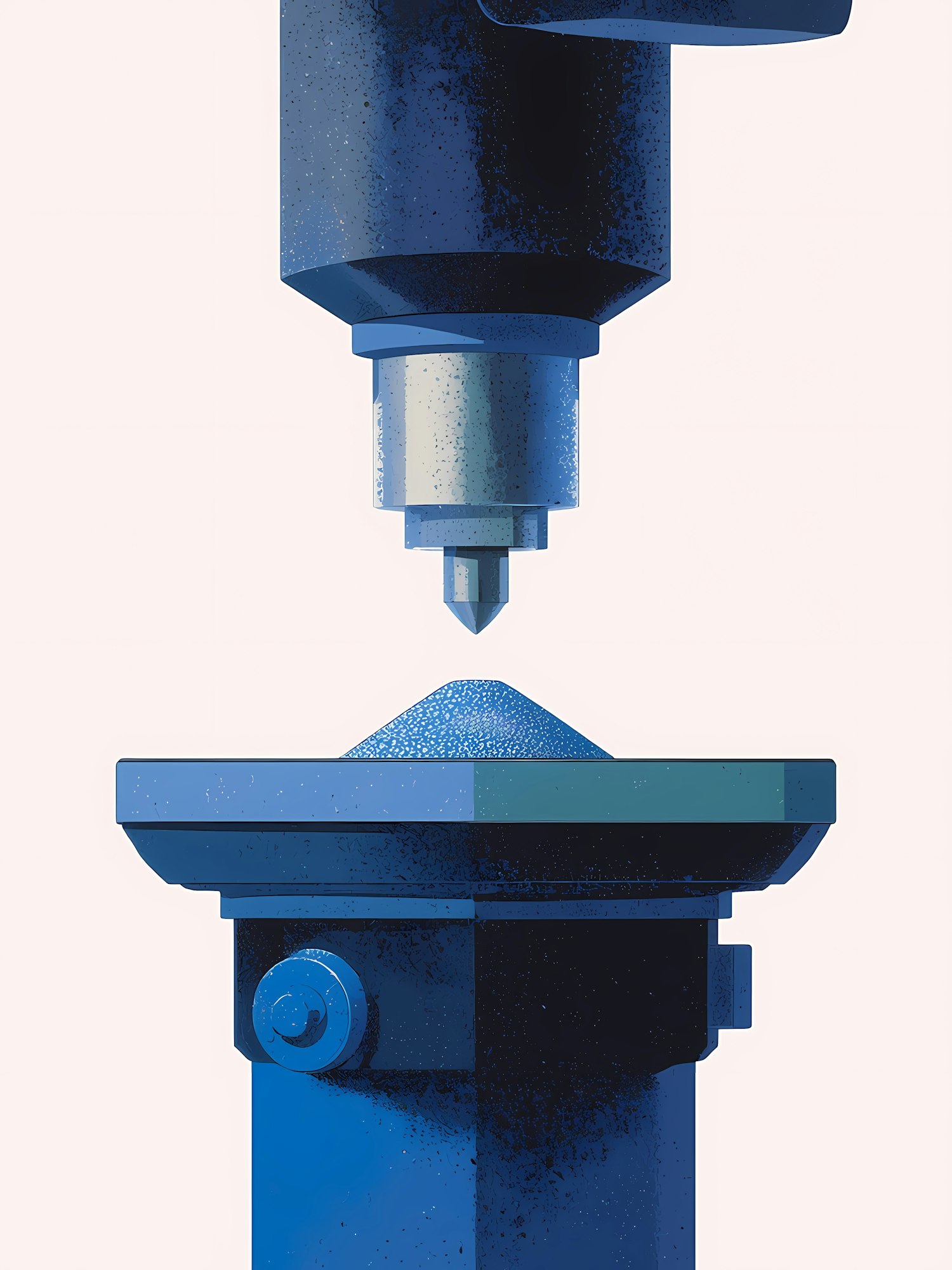 Stylized illustration of a mechanical press with a pointed tip, emphasizing geometric shapes and gradients in blue tones.