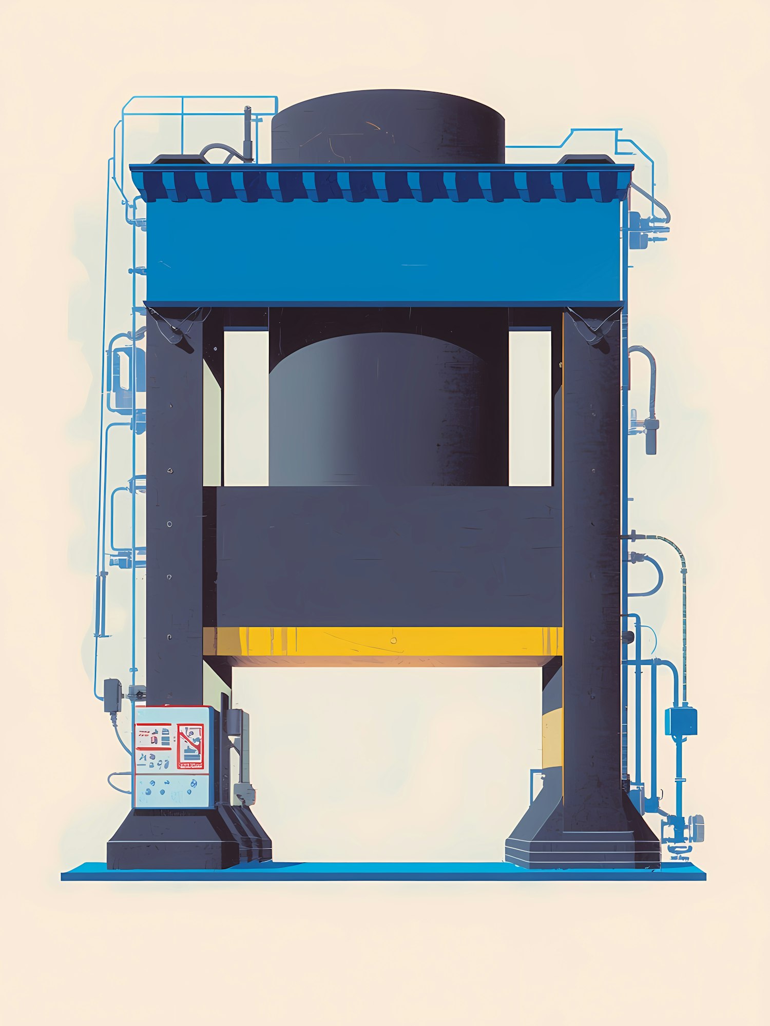 Stylized illustration of an industrial press machine with blue, black, and yellow accents, showcasing detailed mechanical components.