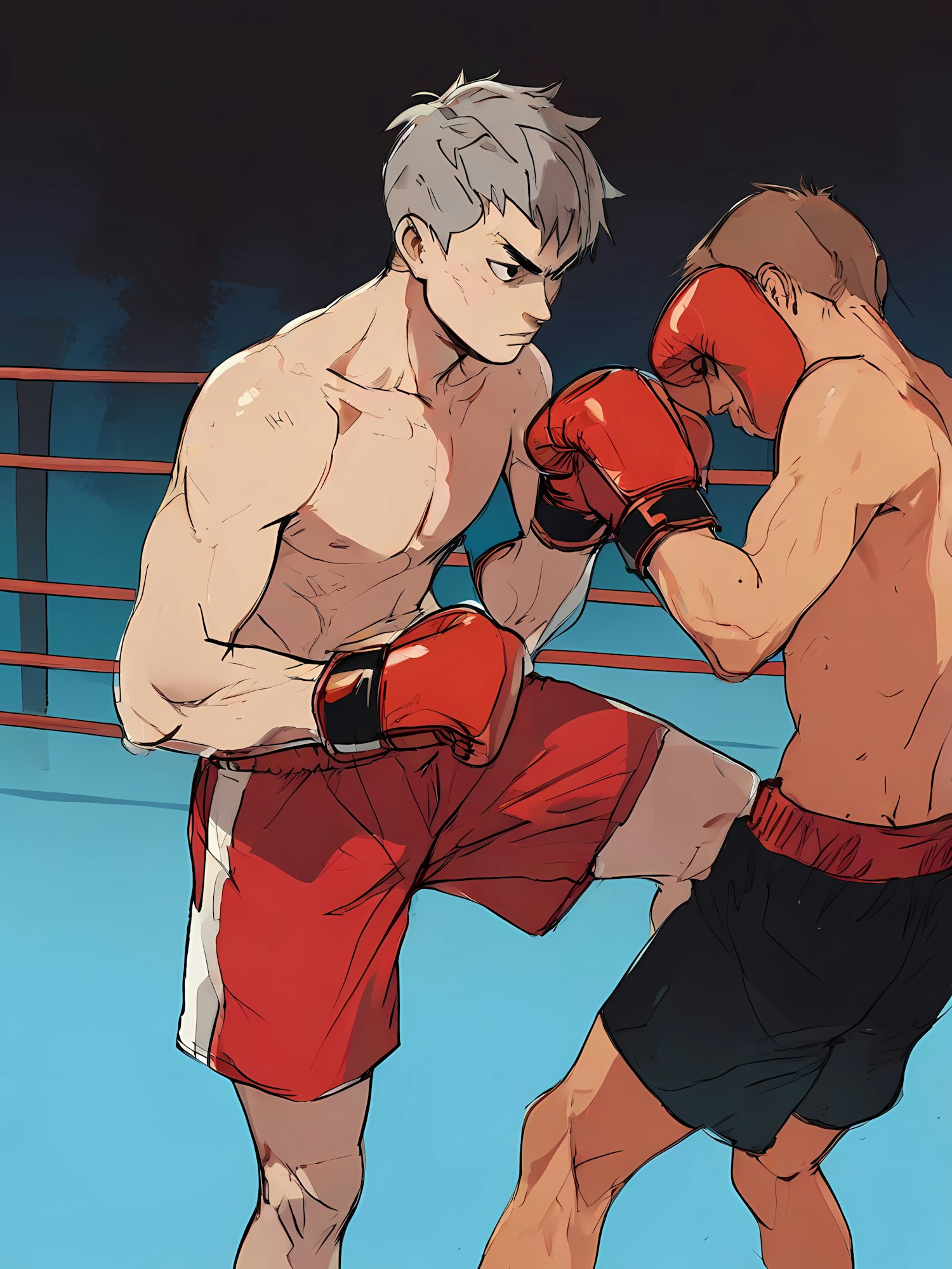 Intense boxing match illustration with two fighters in action, showcasing dynamic movement and vivid colors.