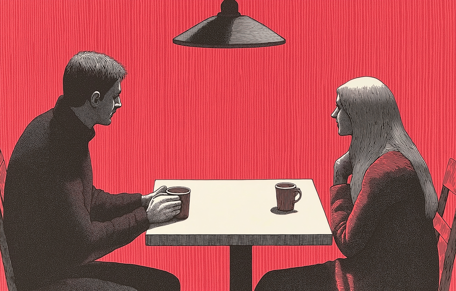 Illustration of a man and woman having coffee at a table against a bold red background.