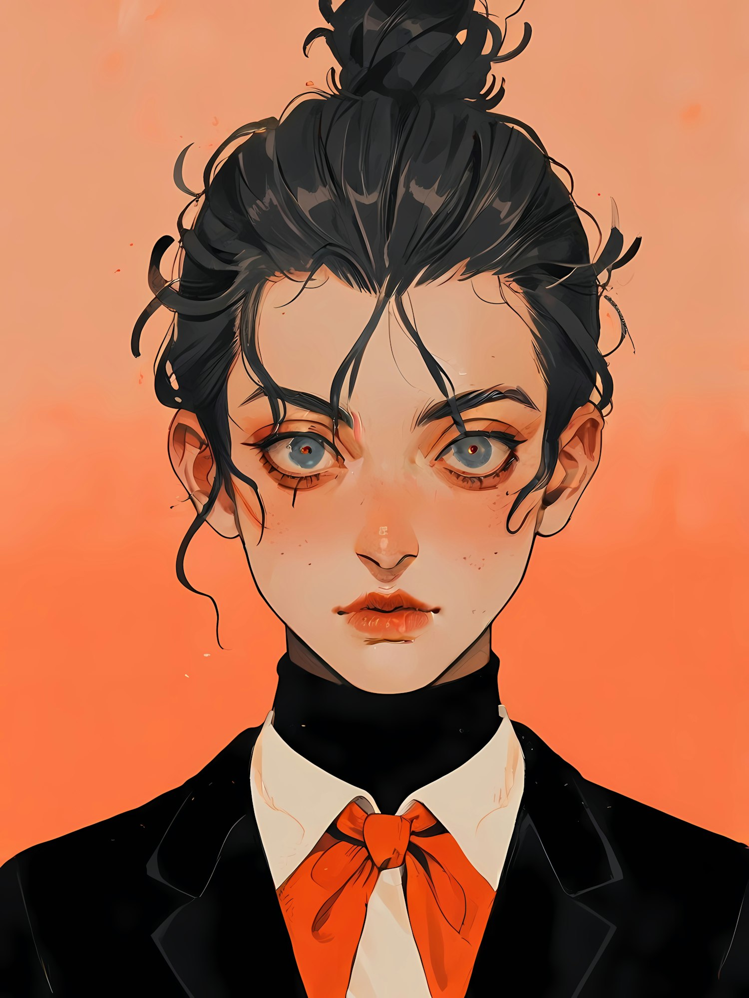Illustration of a young woman with blue eyes, dark hair in a bun, wearing a black suit and orange tie against a peach background.