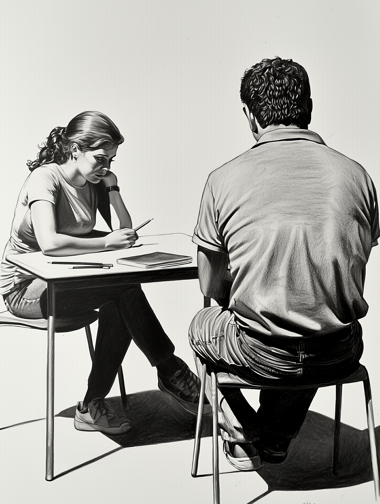 Black and white illustration of two people at a table, one writing, the other observing. Captures a moment of focus and interaction.