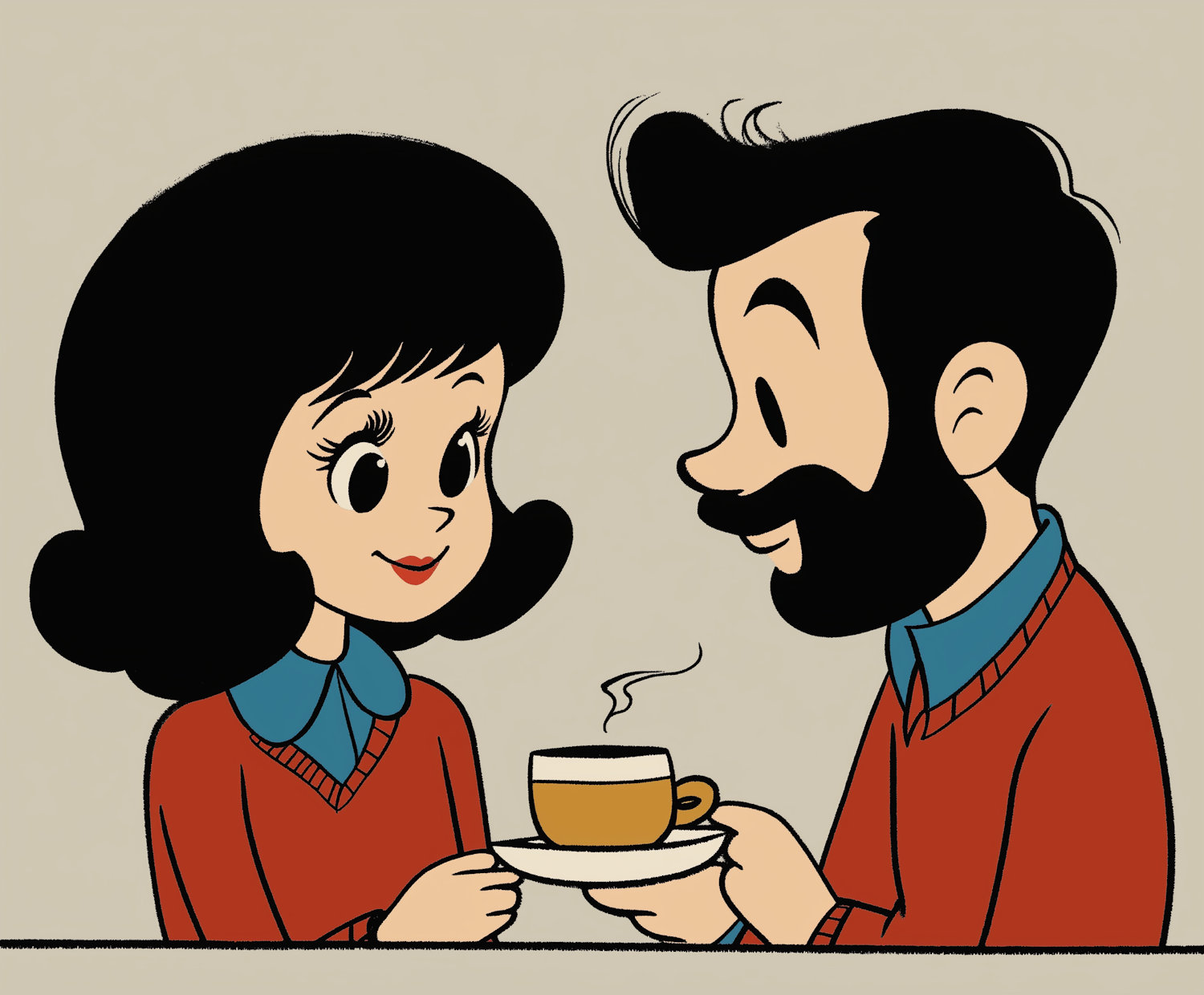 Cartoon illustration of a couple sharing coffee, featuring warm expressions and retro-style outfits in a minimalist beige background.